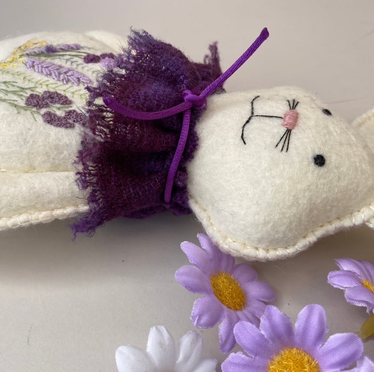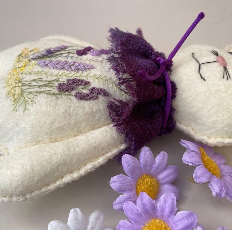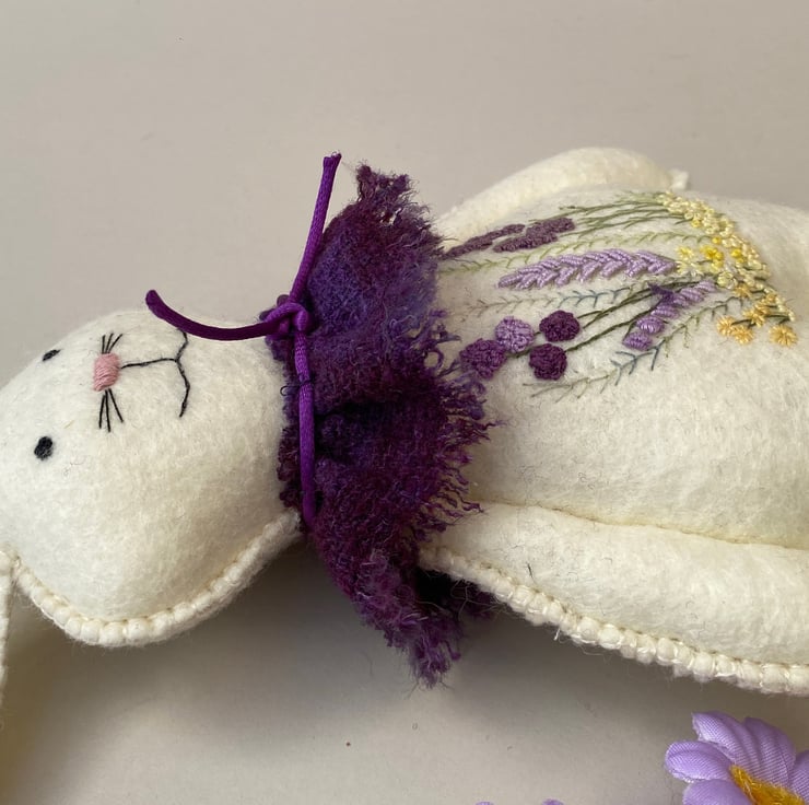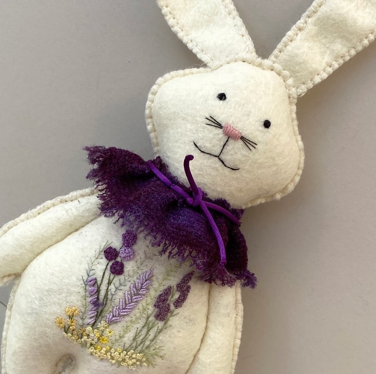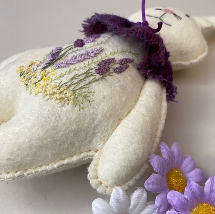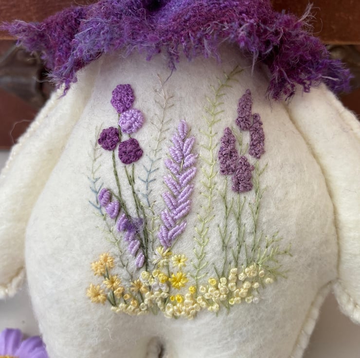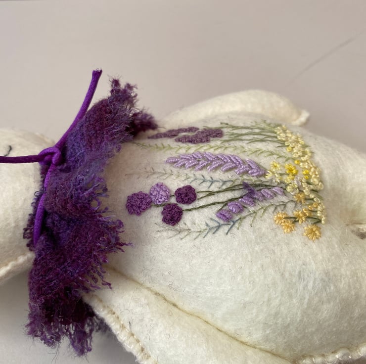 Made from 100% wool felt in a very pale lemon ivory with hand embroidered floral details to his body front in lilacs, lavender, purples and yellows with green stems .