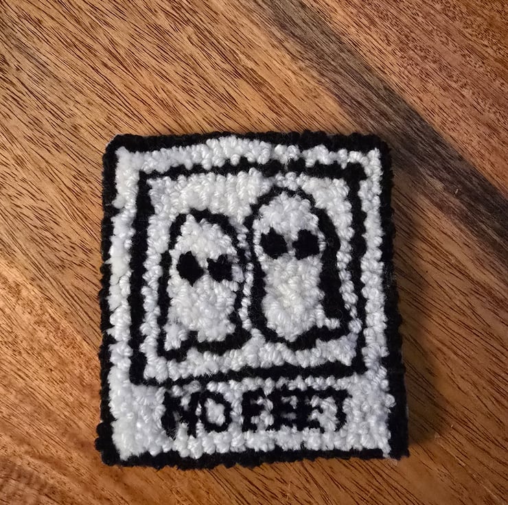 Perfect for those who love beetlejuice. A punch needle mug rug /coaster inspired by beetlejuices photo....No Feet.