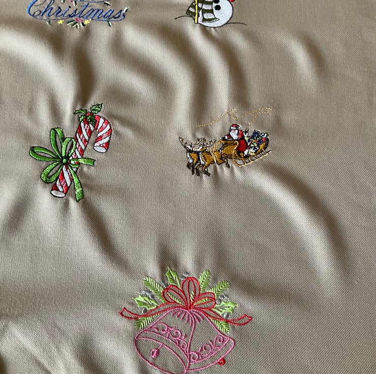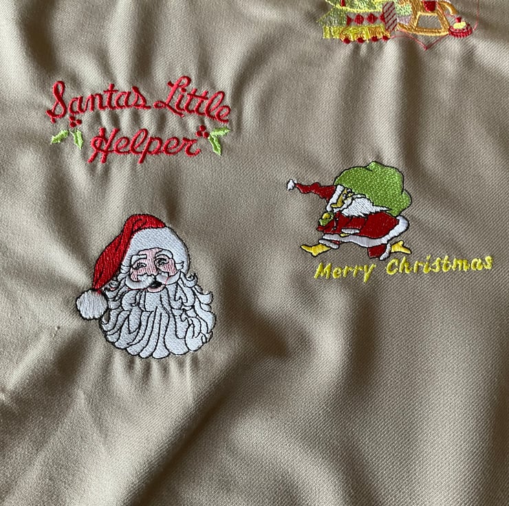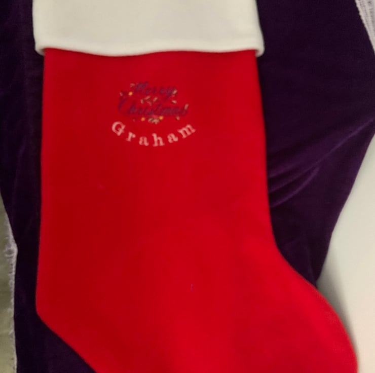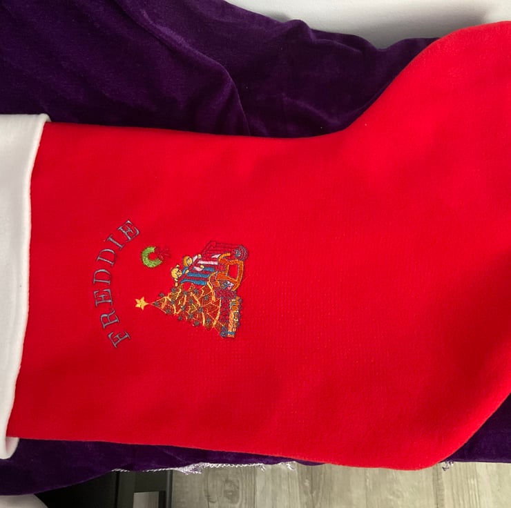 Red Fleece Christmas Stocking embroidered with image of one of the pictures detailed and name of your choice. It will measure 24” long with an opening measurement of 12”. It will be fully lined.