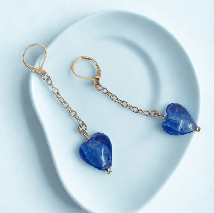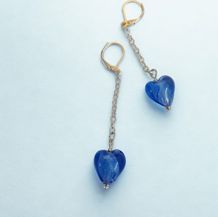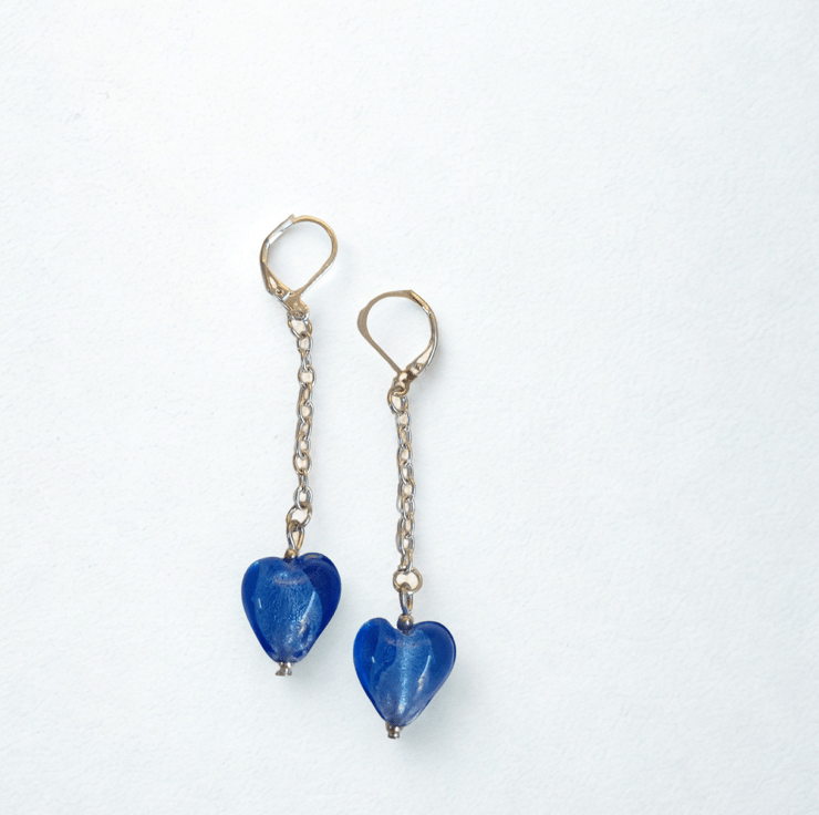 Lovely blue glass hearts elegantly hanging on silver chains on nickel free 925 silver lever back hooks.