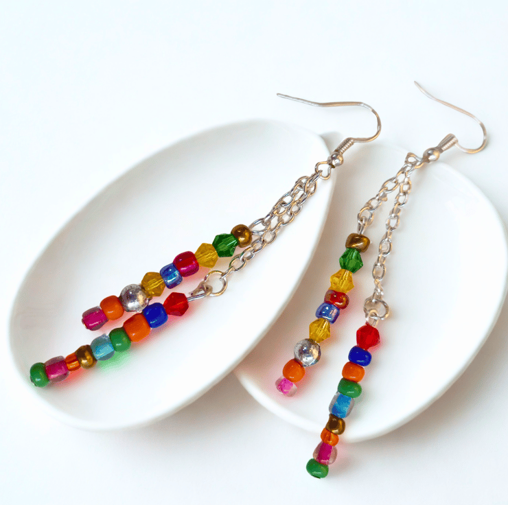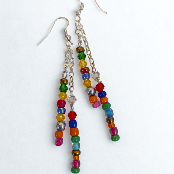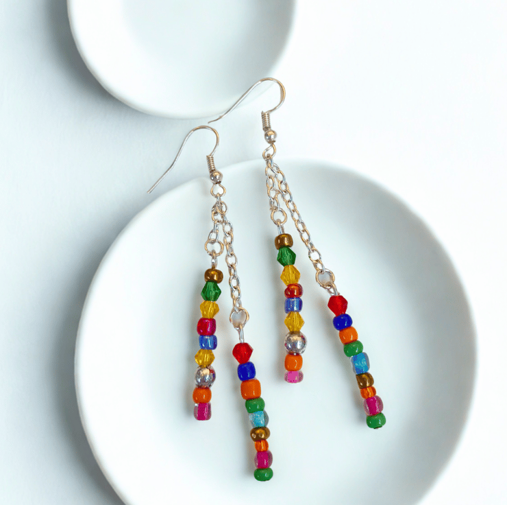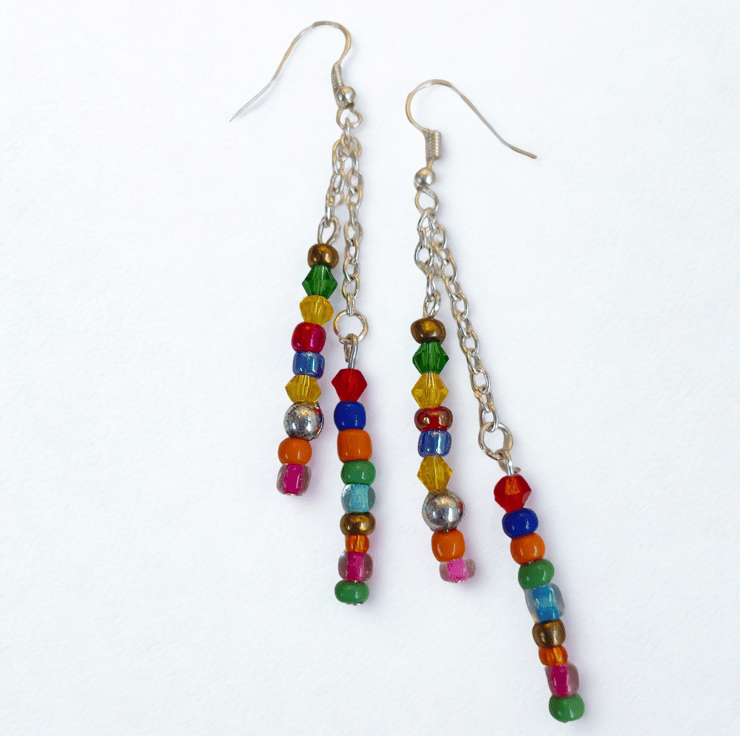 Rainbow coloured threads of tiny glass beading. Hanging on silver chains, lightweight and very delicate. Traditional nickel free 925 silver hooks.