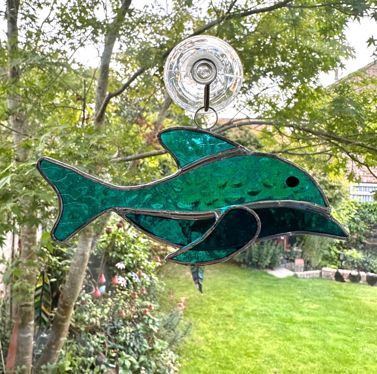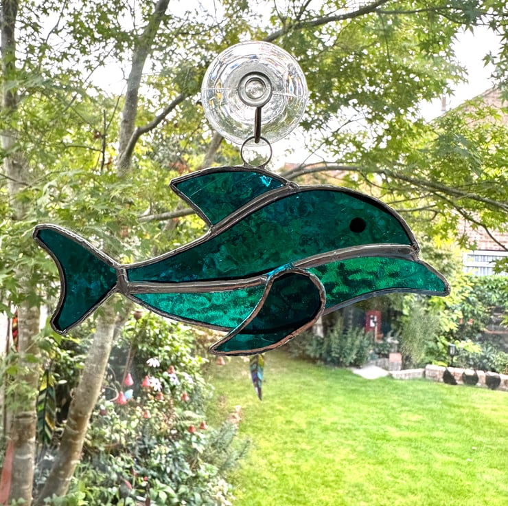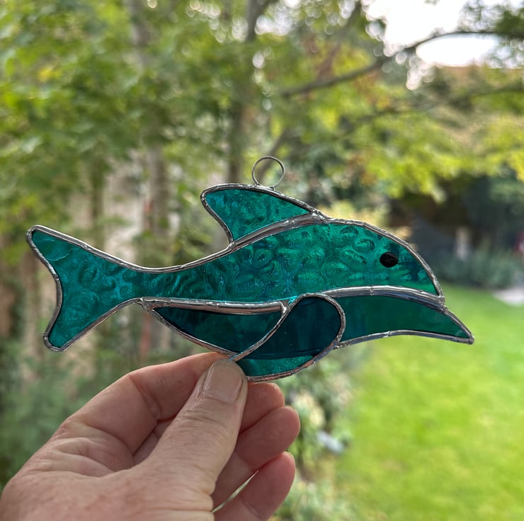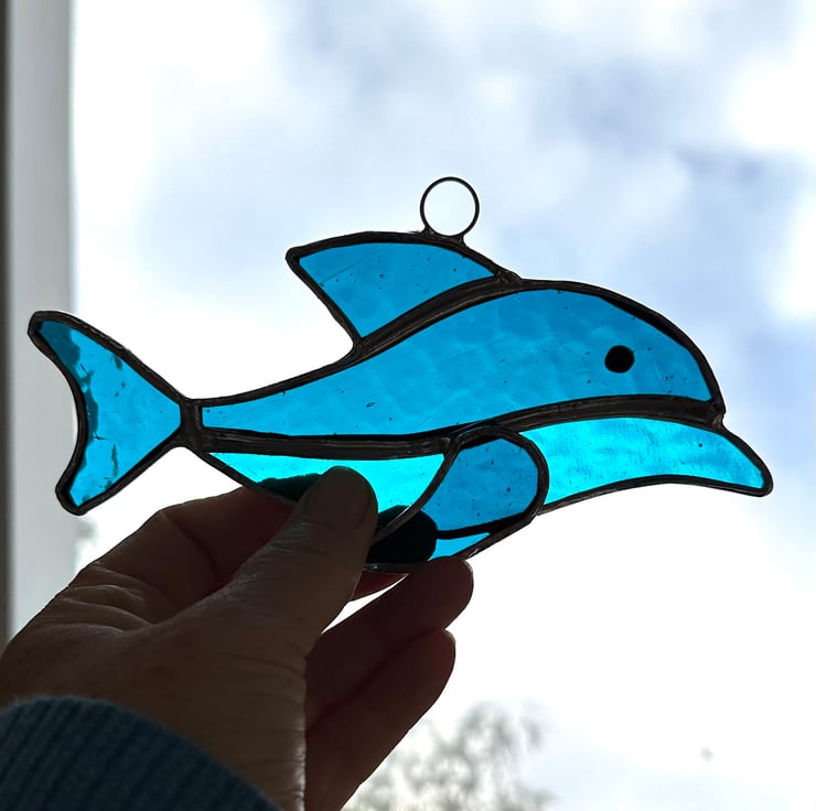 Dolphin suncatcher made in stained glass by Carole's Glass.