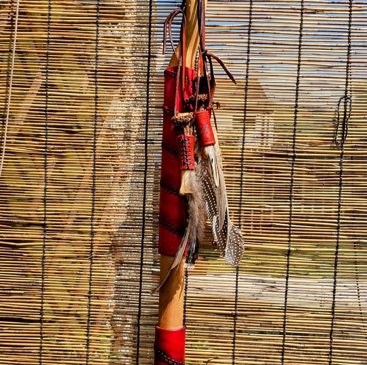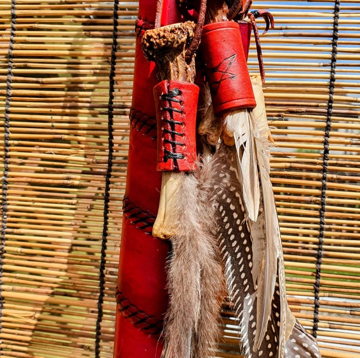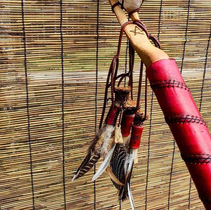 The One Staff. The staff that was made to rule them all. The hand cut cradle holds the crystal at the height of 73 inches. Bound in leather as added support, this staff was built to wield great power upon your enimies or foes. Three bunches of bone and feather wrapps adorn the crown and cast shadows upon the high leather bound grip.