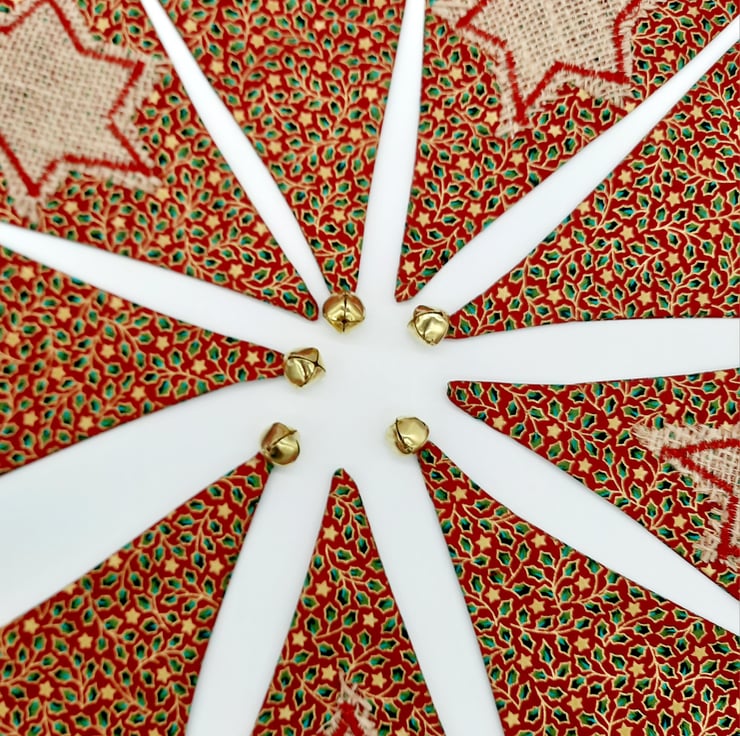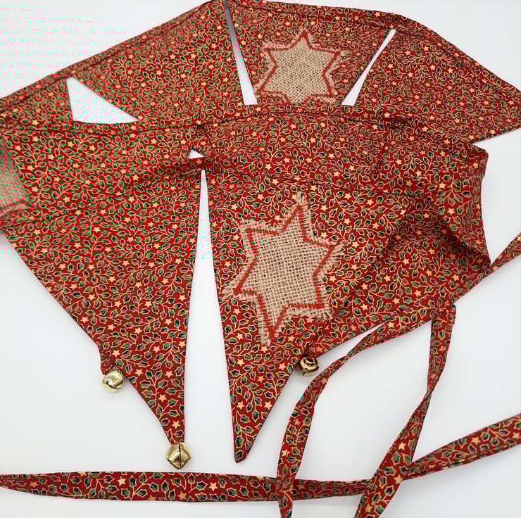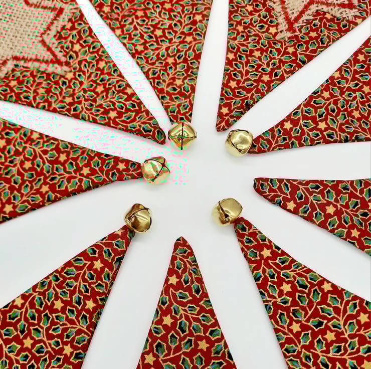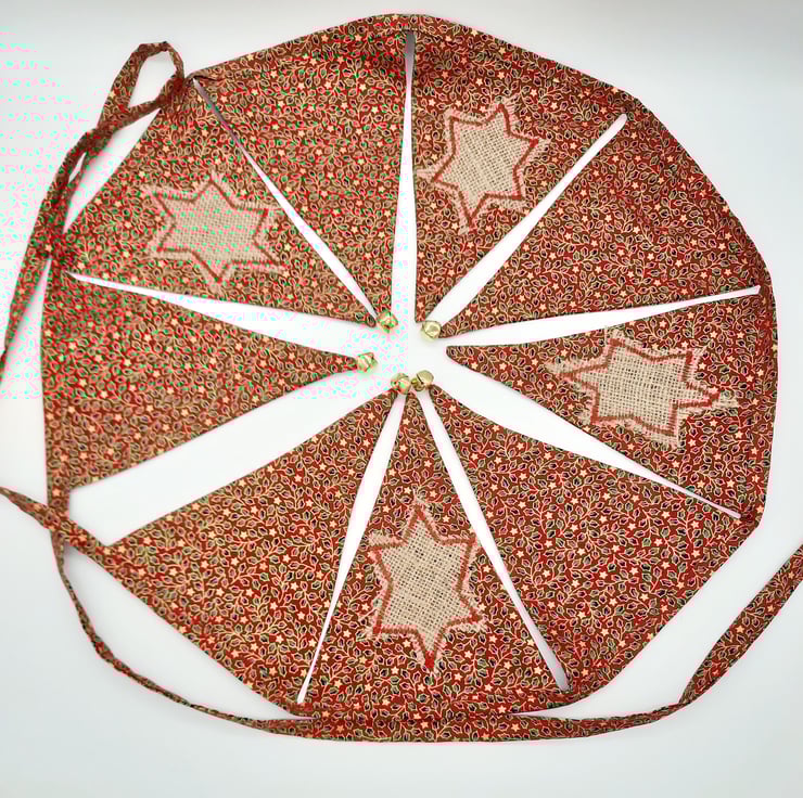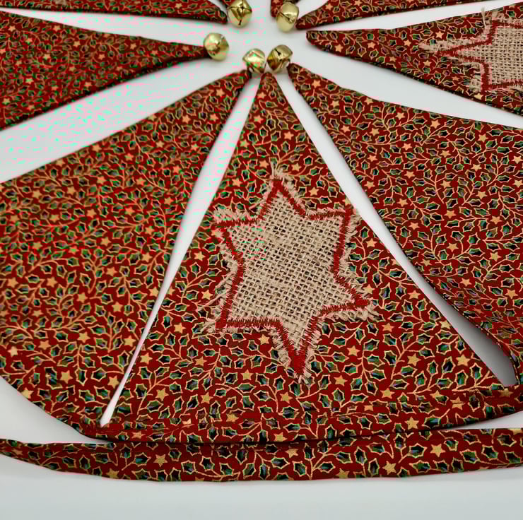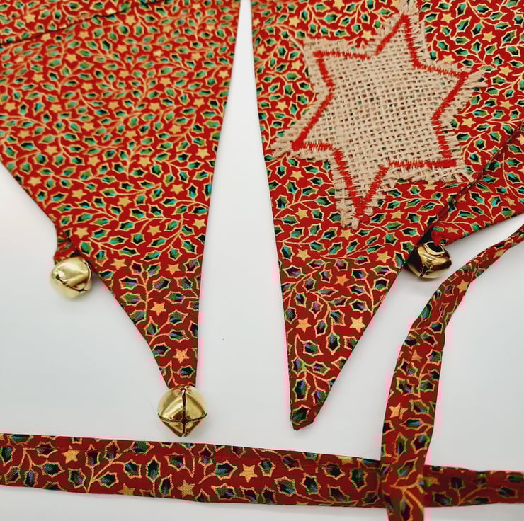 There are 9 triangles in total. 5 have a gold coloured bell on the end and the other 4 have a hessian star. Each star has been embroidered with the applique technique.