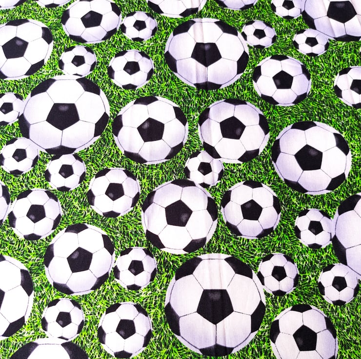 Here's a pinny for the young football enthusiast! The fabric of which I made it is printed with black and white footballs on a background of bright green grass. The apron measures 21.5" (55cm.) approximately from neck to hem and 17" (43 cm.) at the widest point. It fits a child between roughly six and ten years old. The straps are acrylic herringbone and the apron is good quality cotton. It can be machine washed.