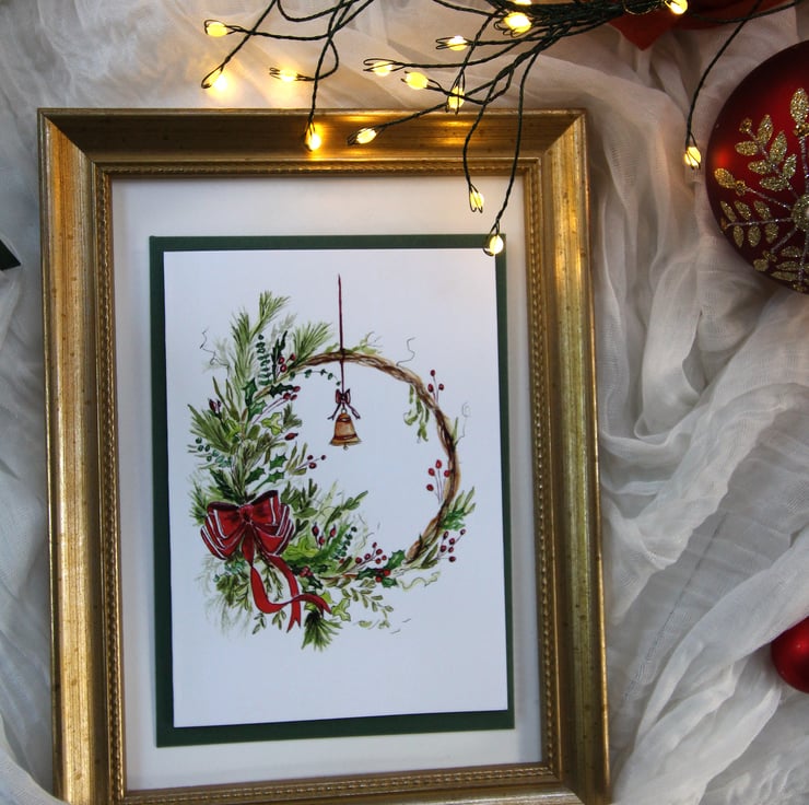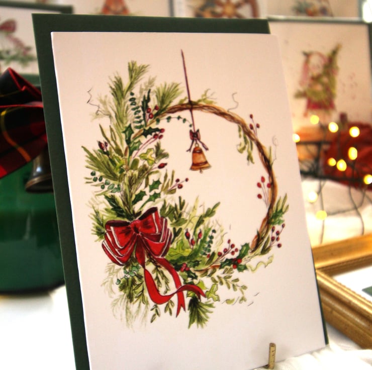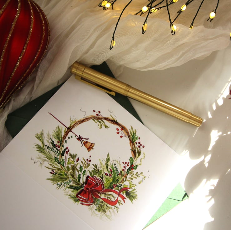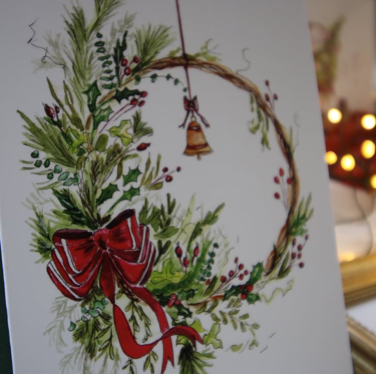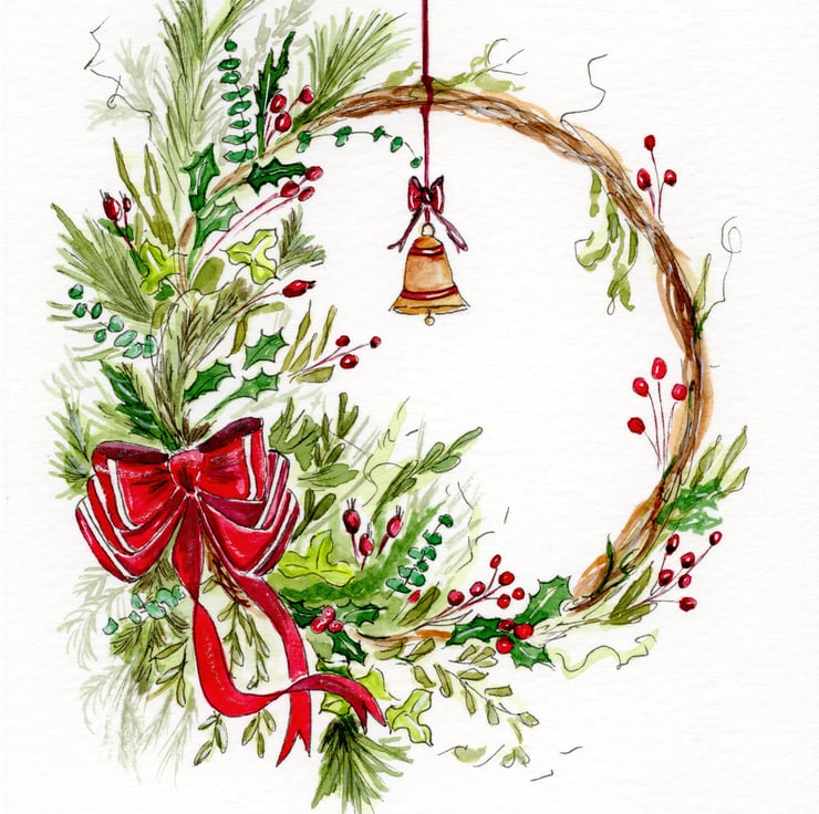 Classic and timeless, this card features a festive Christmas wreath painted with winter greenery, red berries, and a single golden bell at its centre, all tied together with a bold red bow with a white stripe (because I love stripes! ). A perfect companion to the Traditional Christmas Tree card, it captures the warmth and elegance of Christmas in its Classic form.