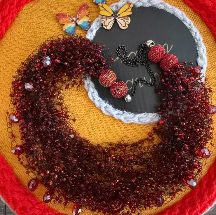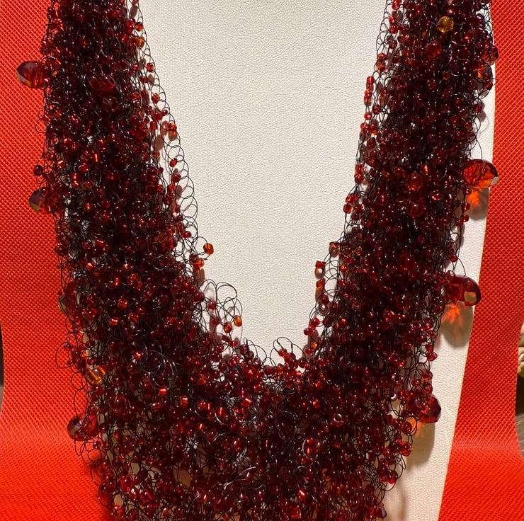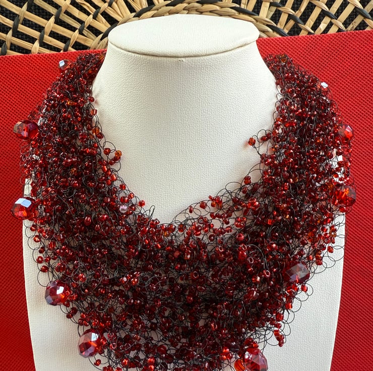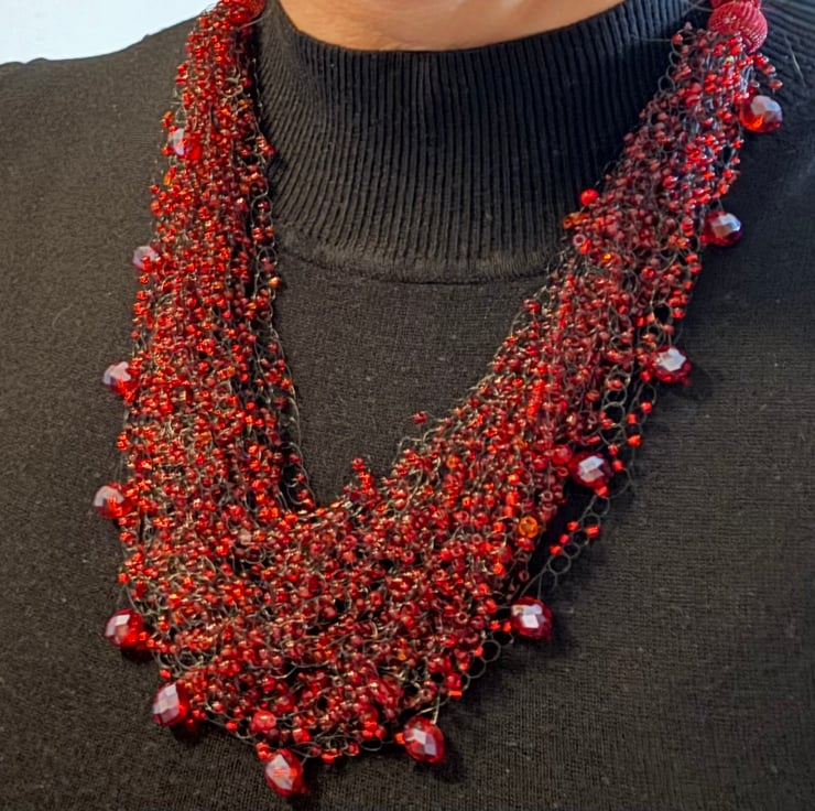 This handmade beaded necklace is a stunning statement piece inspired by the traditional Ukrainian “air necklace” design. Carefully crocheted with fine black thread and vibrant red glass beads, this lightweight yet bold necklace adds a unique, artistic touch to any outfit. Its intricate layering gives it a soft, airy look while remaining comfortable to wear all day. Perfect as a gift for her, this artisan necklace is ideal for weddings, parties, or simply elevating your everyday style.