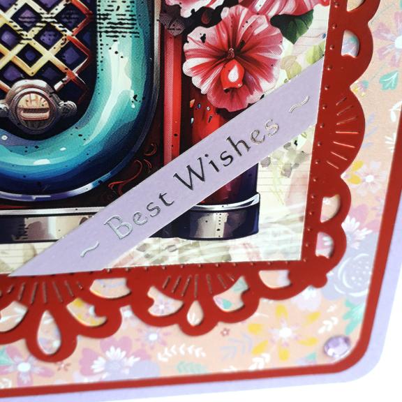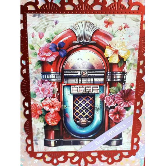 A red juke box adorned with red, orange, purple, pink and yellow flowers is the image on this birthday card, I have placed the image in a die cut red metallic card frame which is on a floral background, more red metallic and finely a lilac base card.