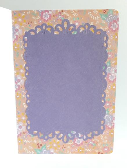 Inside the card is the same patterned paper as the front with a blank lilac die cut rectangle for you to write your message.