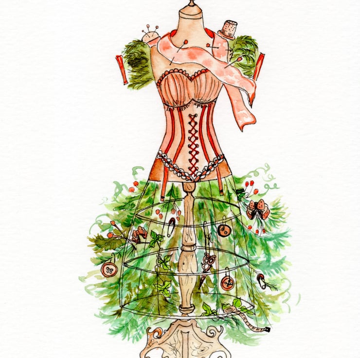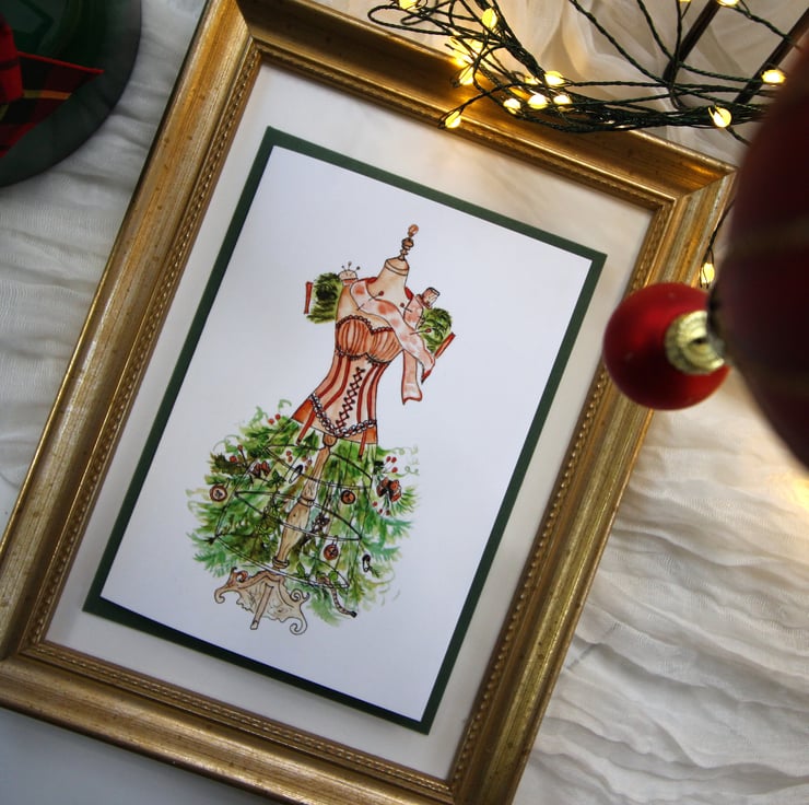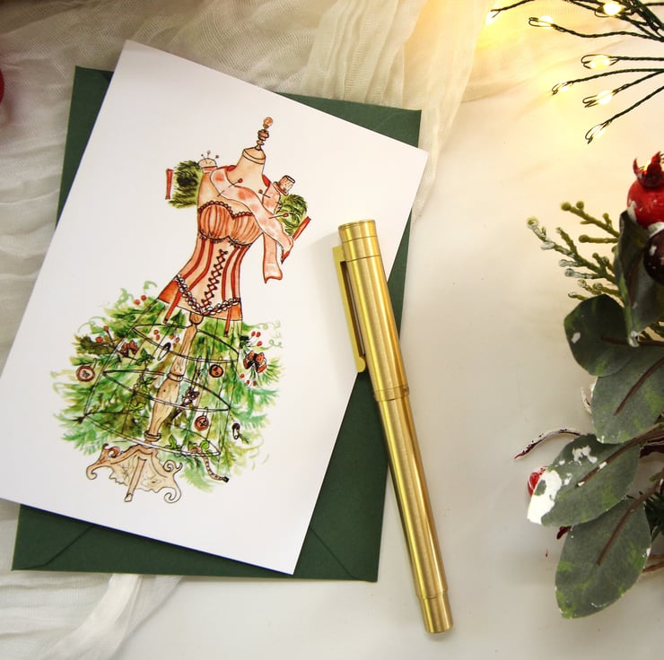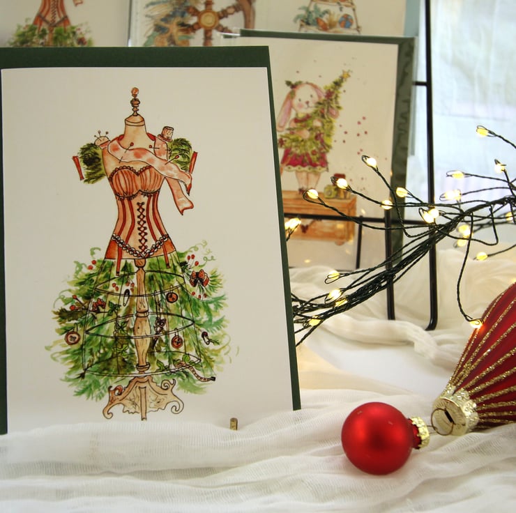 Celebrate Christmas with a fun yet elegant twist! This card features a dressmaker’s mannequin transformed into a festive Christmas tree, adorned with sewing treasures – buttons, ribbons, pins, and a touch of vintage charm. A perfect card for craft lovers, seamstresses, and those who cherish handmade traditions.