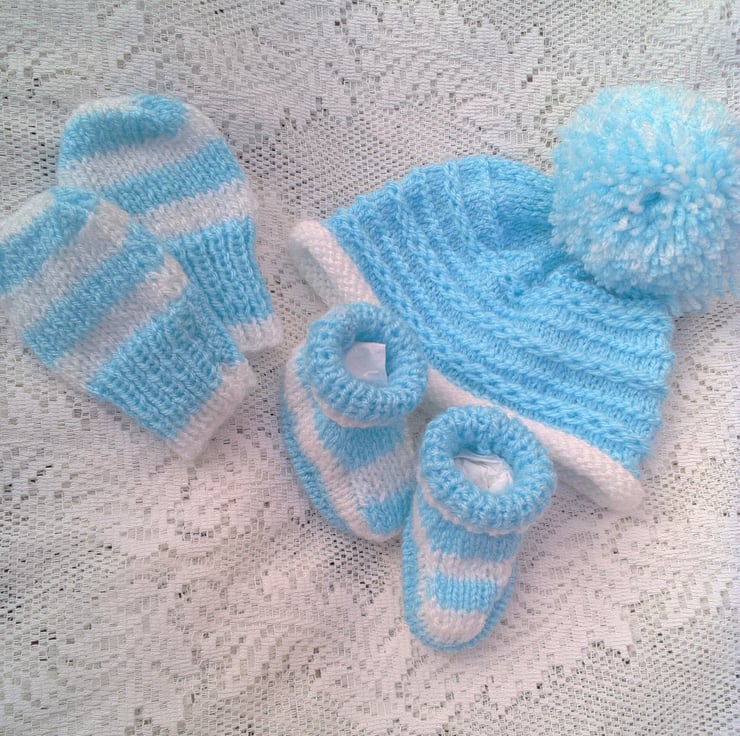 Baby's Knitted Blue and White 5 Piece Pram Set, Outdoor Clothes, Custom Make