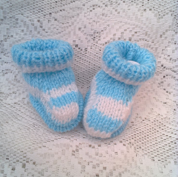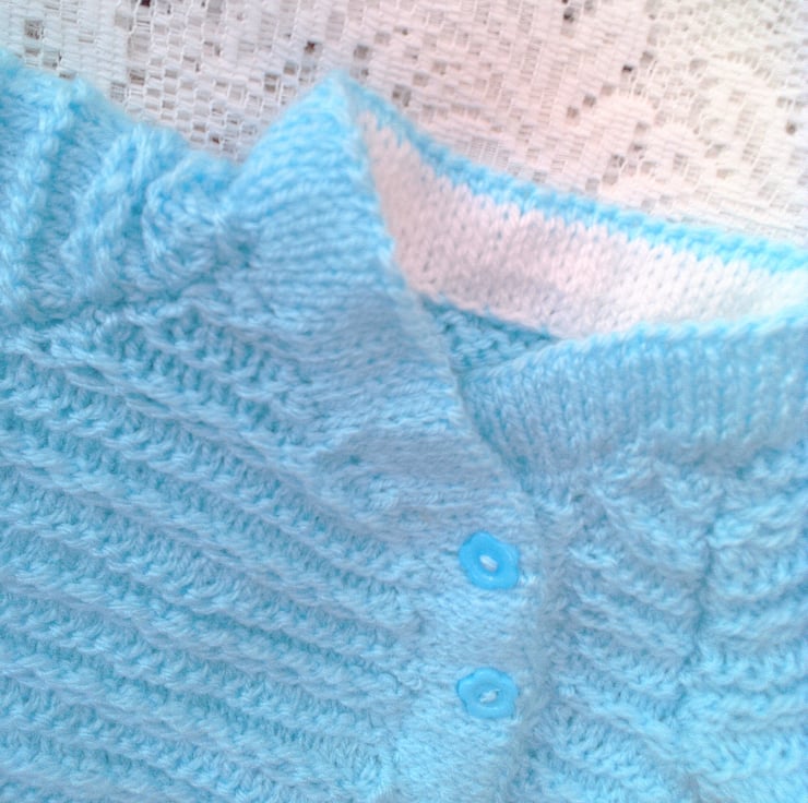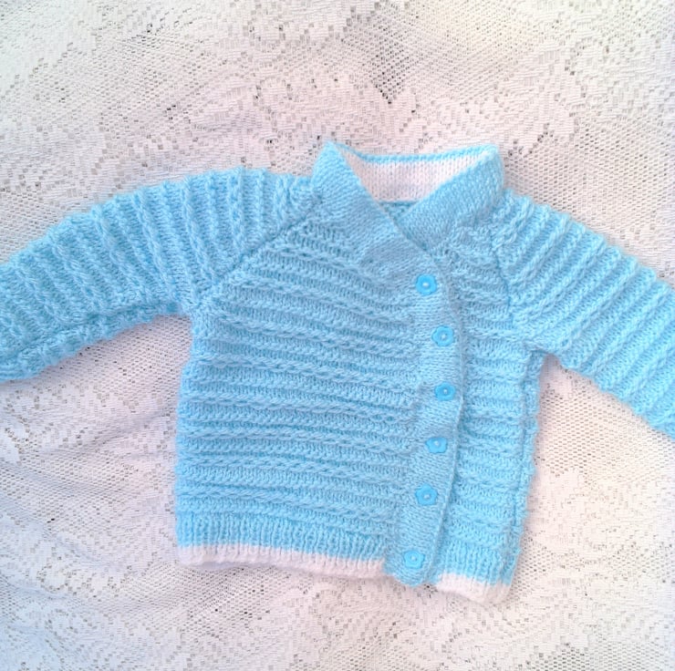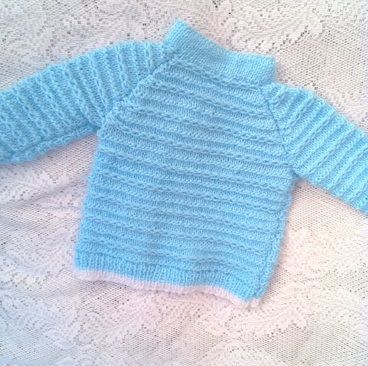 It is currently in stock in a size to fit a 0 - 3 month old baby with a 16 inch chest in this blue and white colour combination in acrylic double knitting yarn, it can also be made in a size, colour and yarn type of your choice, please see below for sizes available and state colour required when you order. If you require a different yarn type other than acrylic then please message me to discuss further. The processing time will be 1 - 2 weeks to produce and post to you.
