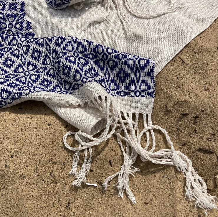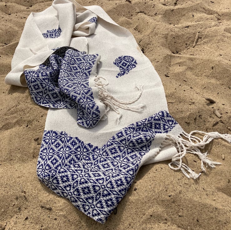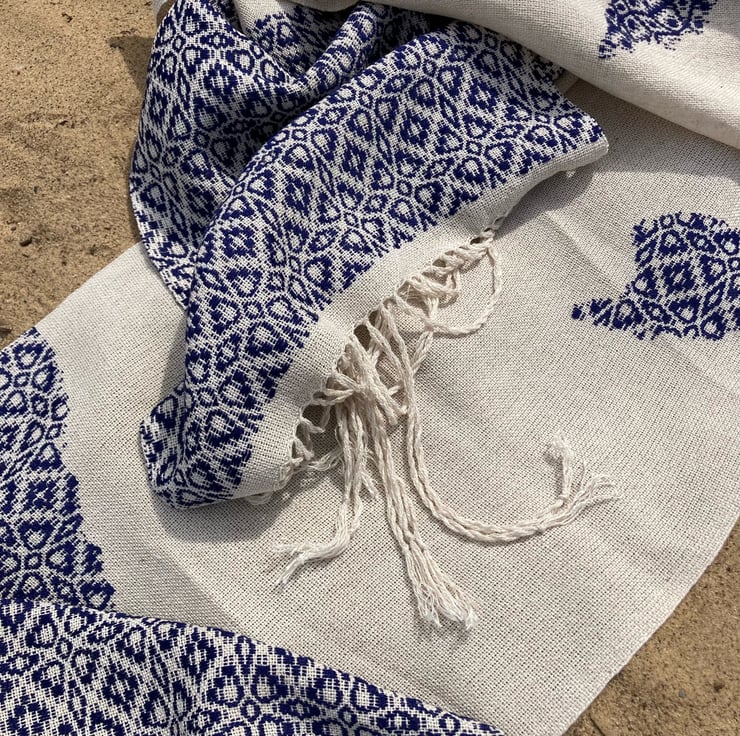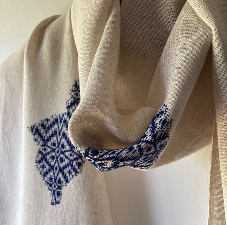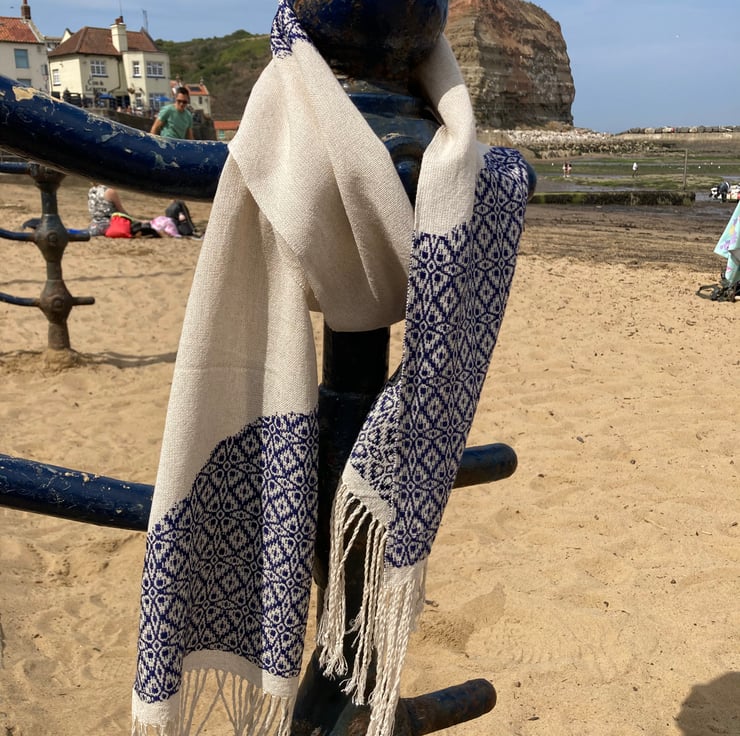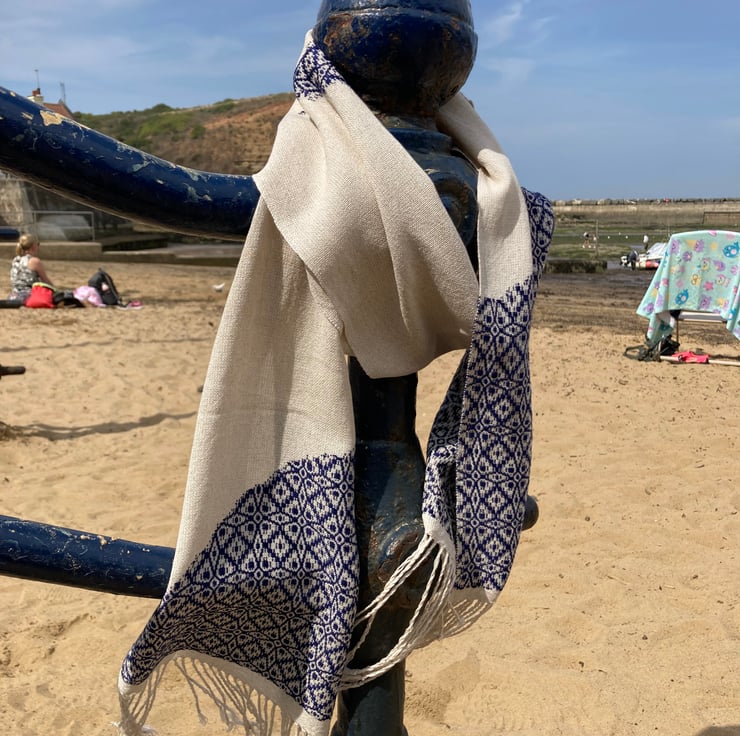A handwoven natural, unbleached cottolin scarf with inlays of white linen and blue silk in a tiny overshot pattern. Created in response to coastal erosion at Robin Hood’s Bay, materials returning to the earth, and sea pottery washed to the tideline. The scarf features an intricate overshot pattern that echoes transfer-printed pottery. Traditionally finished with a steam press to create a supple and very light drape.