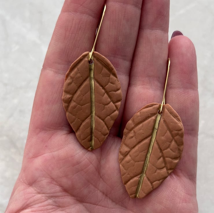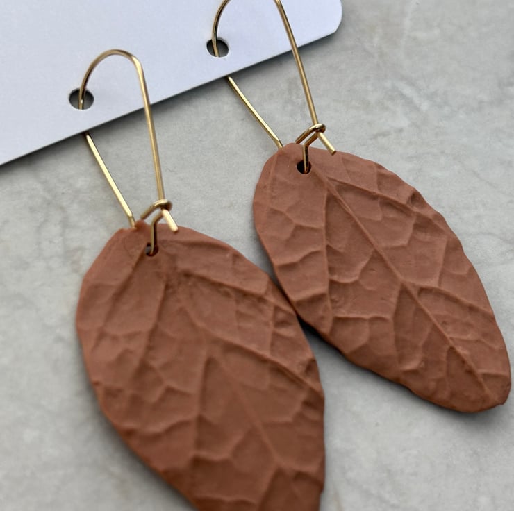 Add a touch of nature-inspired elegance to your jewellery collection with these beautifully handcrafted polymer clay earrings. Each earring features a textured clay leaf in a warm tan tone, finished with gold detailing. Suspended from hypoallergenic kidney wire earrings, making them lightweight and comfortable for all-day wear.