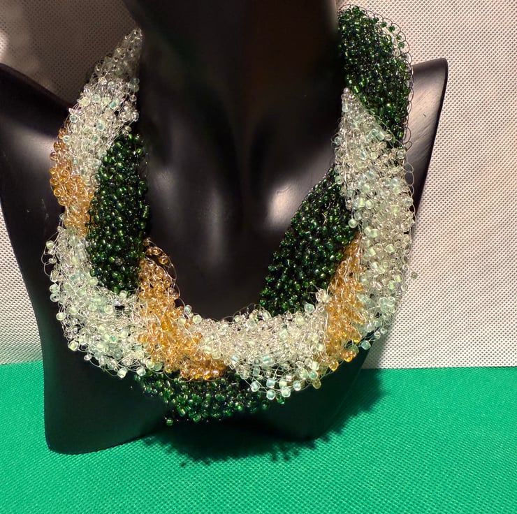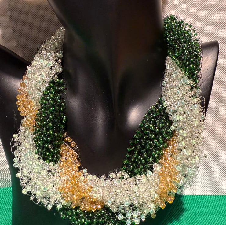Carefully crocheted with fine thread and vibrant red green, light green and gold beads, this lightweight yet bold necklace adds a unique, artistic touch to any outfit. Its intricate layering gives it a soft, airy look while remaining comfortable to wear all day. Perfect as a gift for her, this artisan necklace is ideal for weddings, parties, or simply elevating your everyday style.