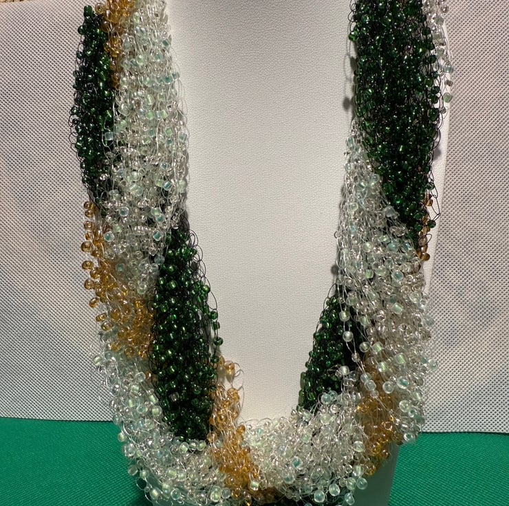 Air Necklace with green, light green and gold Beads