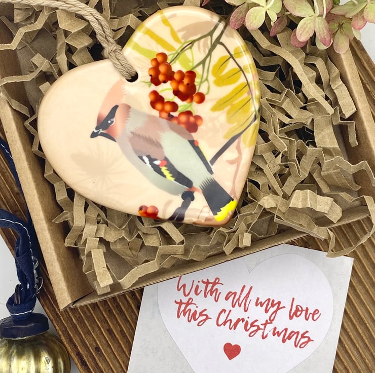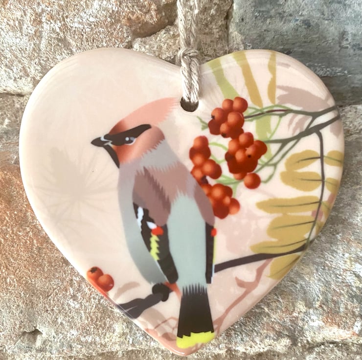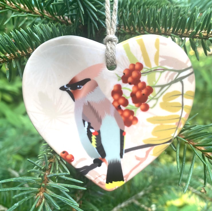 Waxwing with Winter Berries Heart Decoration - a beautiful decoration for your tree or gift to a nature lover! Featuring my original illustration of a beautiful Waxwing feasting on Winter Sorbus berries.