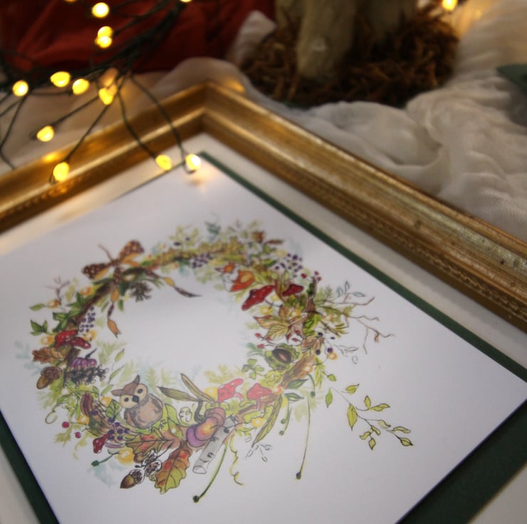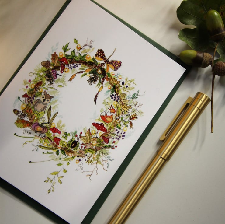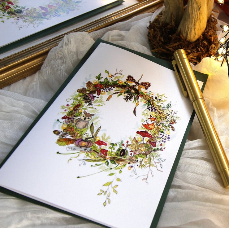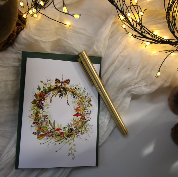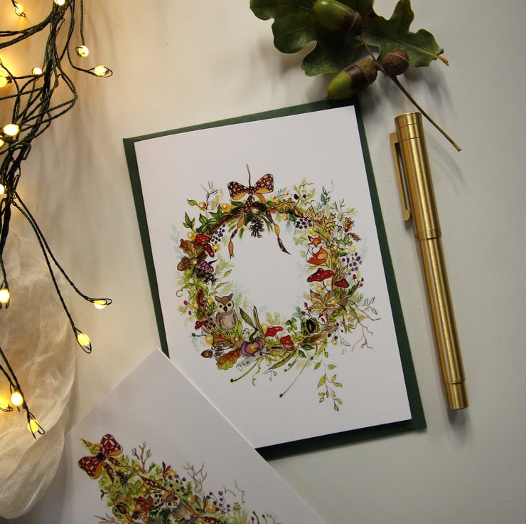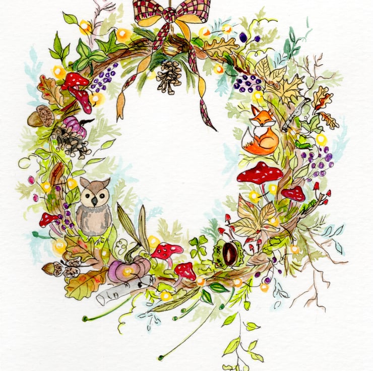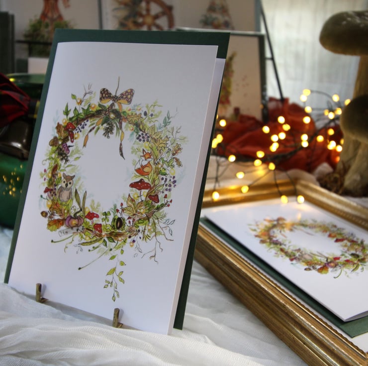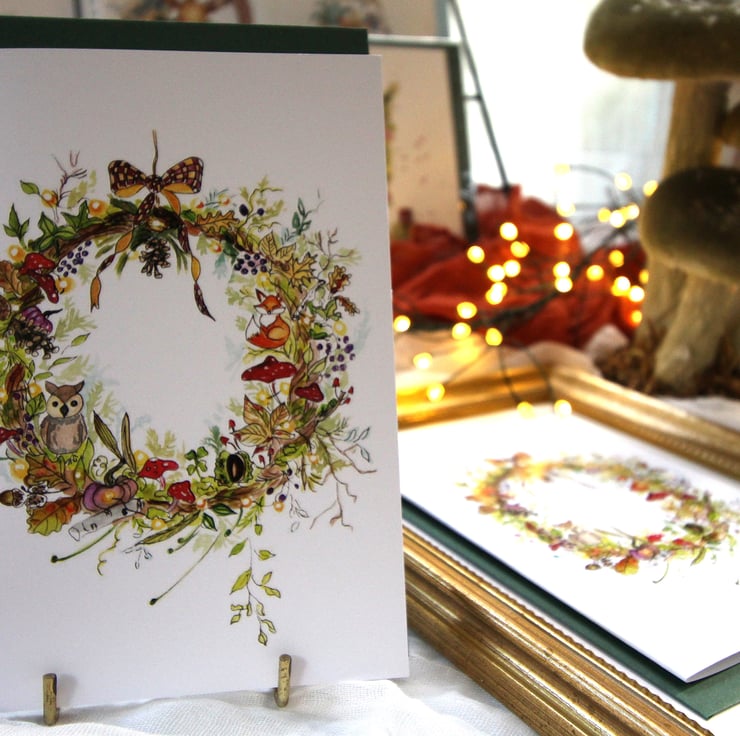Bring the beauty of autumn into Christmas with this woodland-inspired wreath card. Painted in warm seasonal tones, the design features oak leaves, pinecones, acorns, and woodland animals — including a fox and an owl — nestled amongst the foliage. A cosy, nature-filled take on festive cheer, perfect for those who love autumn just as much as Christmas.