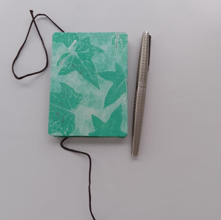 A small concertina style handmade book, suitable for sketching, notes or journalling. The covers feature my original leaf prints on rice paper, the endpapers are 'vintage' writing. It contains 12 usable pages, made from banana waste in a lovely creamy beige. It is tied with a waxed string and opens flat .