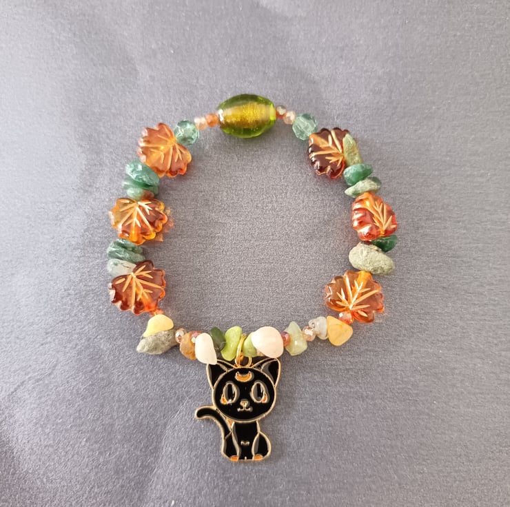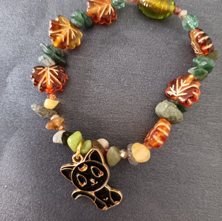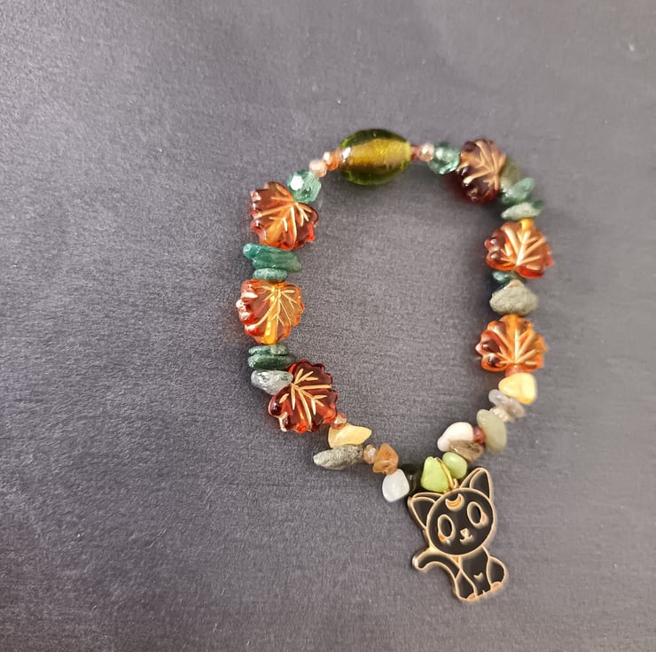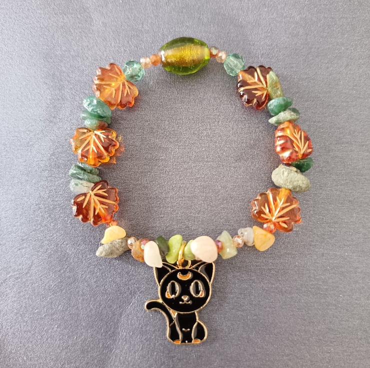 This handmade bracelet is crafted with magic stretch elastic, 6 brown and gold leaf beads, an assortment of beads in earthy tones, moss agate stone chips and featuring a gold and black cute cat charm. This piece measures approximately 7 inches and exudes Autumnal, seasonal vibes