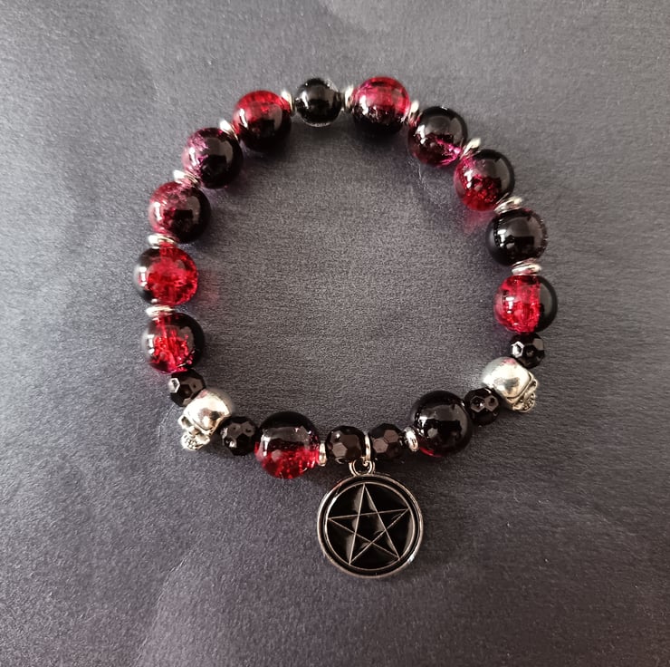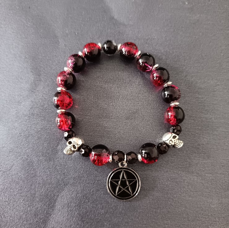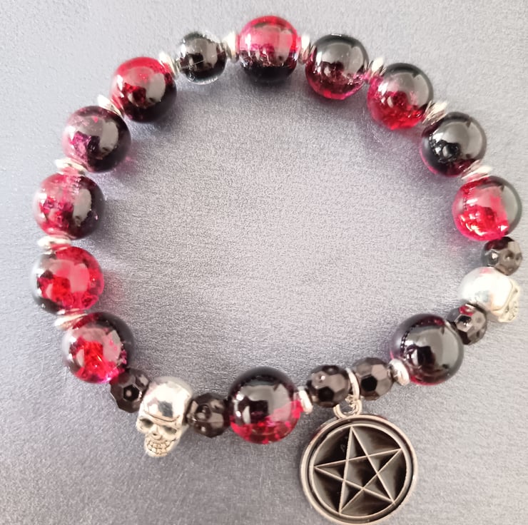 This handmade bracelet is crafted with red and black glass beads, two silver skull beads, decorative silver spacers and featuring a black pentacle charm. Measuring approximately 7.5 inches, this piece is gothic/ alternative style