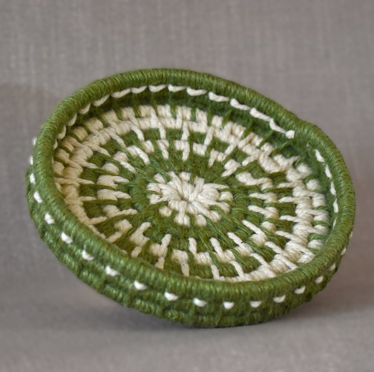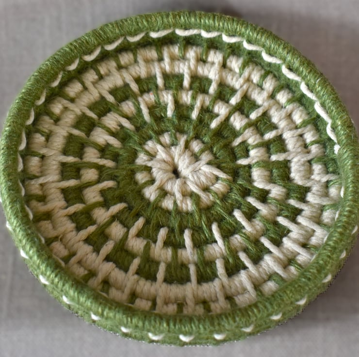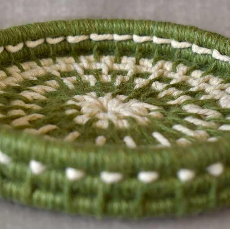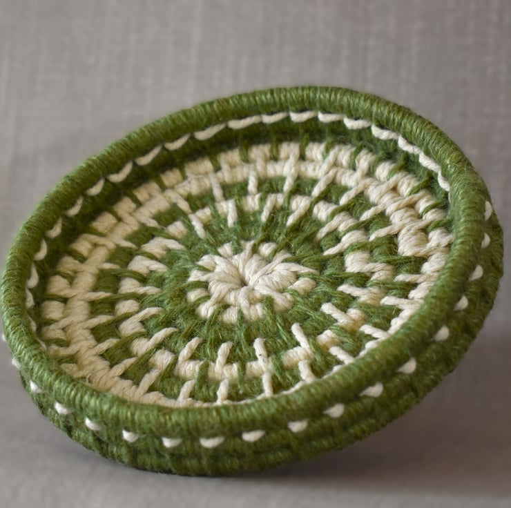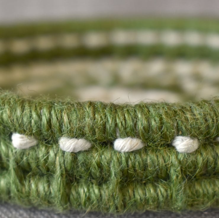 A beautifully handcrafted coiled basket made with a striking combination of apple green rope and natural off-white cotton cord. The basket features a sturdy, tightly coiled design that blends modern style with traditional craftsmanship. The fresh green tone adds a lively pop of colour, while the soft off-white cotton cord balances it with a warm, natural touch.