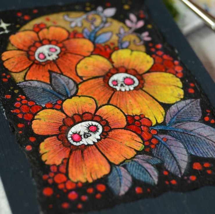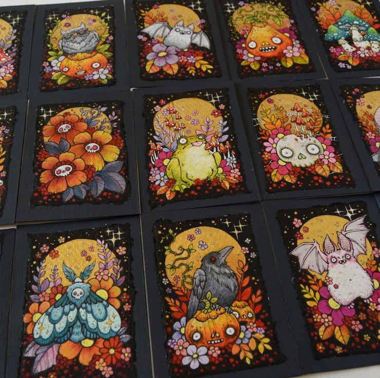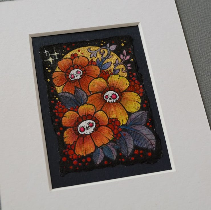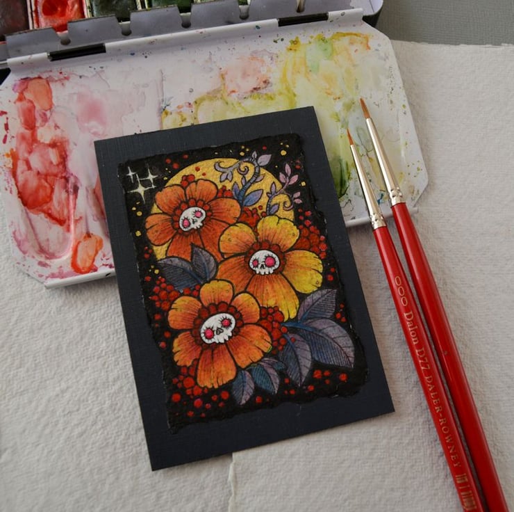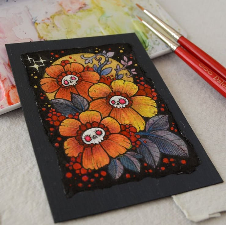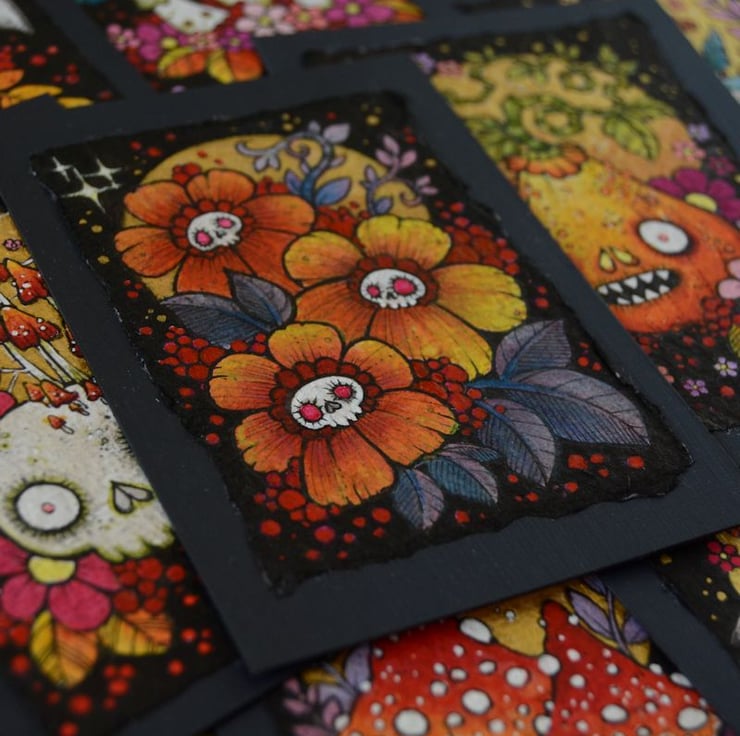 this aceo is an original artwork, hand drawn with a tiny 0.05 nibbed pen, then coloured with ink, artists pens and watercolour paints, on indian khadi paper. khadi paper is handmade from recycled cotton rag, it has a lovely textured surface and deckled edges. i have then mounted the illustration onto 300gsm cardstock, hand painted with a paynes grey to create a dark surrounding edge/background.