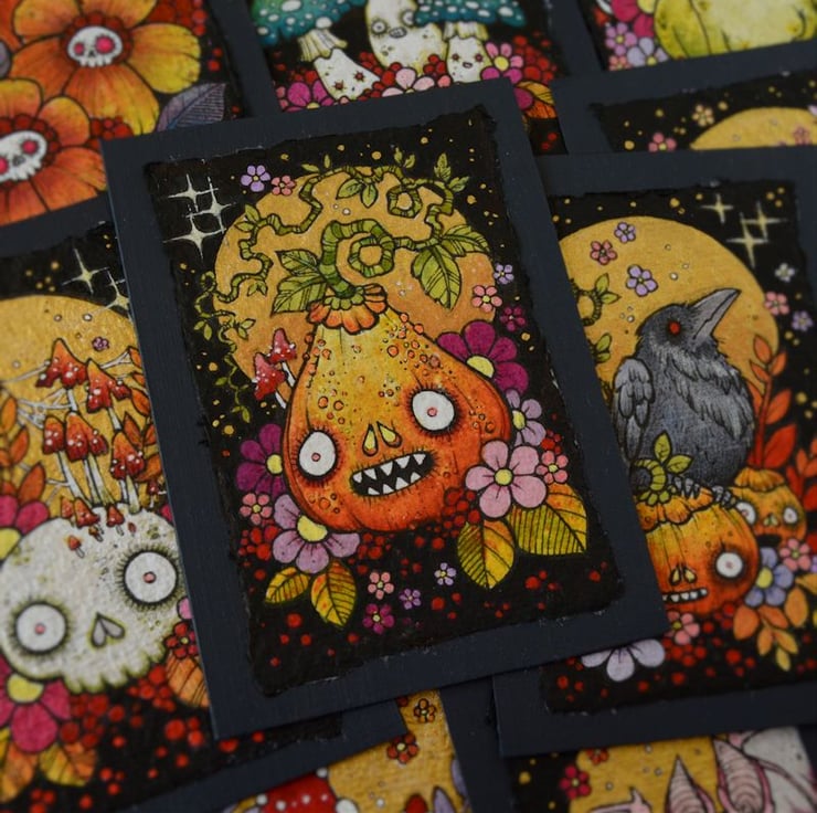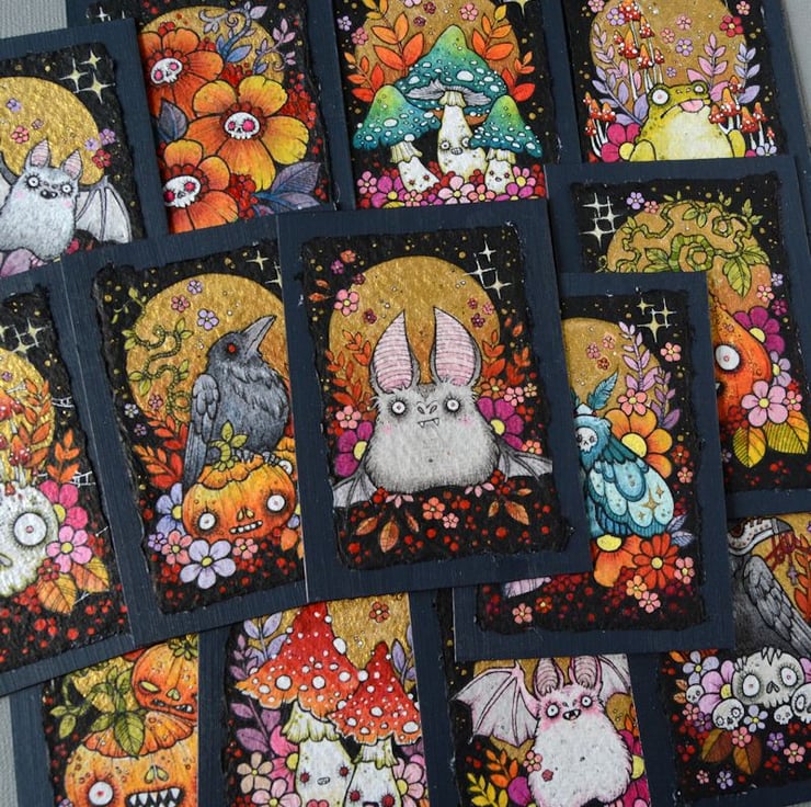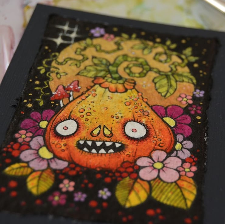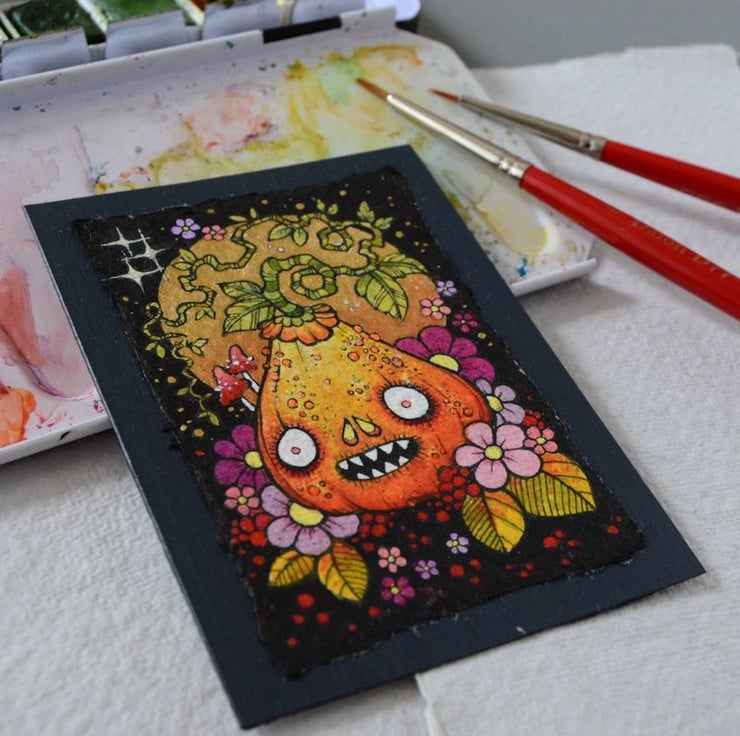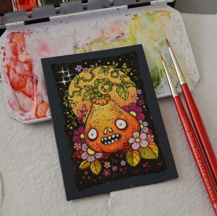 this aceo is an original artwork, hand drawn with a tiny 0.05 nibbed pen, then coloured with ink, artists pens and watercolour paints, on indian khadi paper. khadi paper is handmade from recycled cotton rag, it has a lovely textured surface and deckled edges. i have then mounted the illustration onto 300gsm cardstock, hand painted with a paynes grey to create a dark surrounding edge/background.