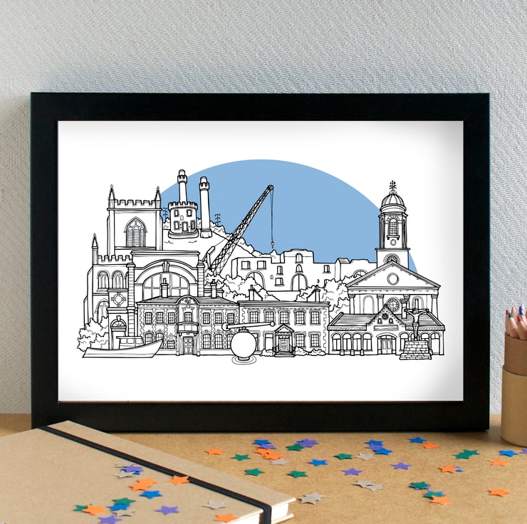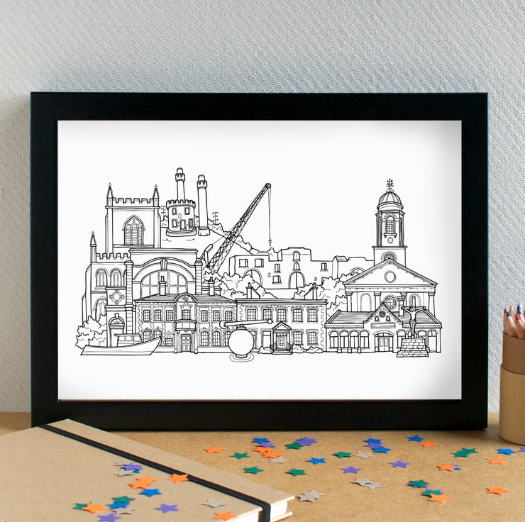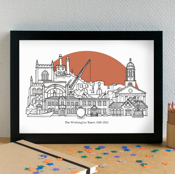 A stunning print of my line drawn illustration of the most famous landmarks in Workington, Cumbria.
