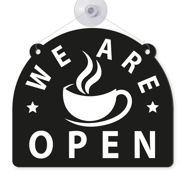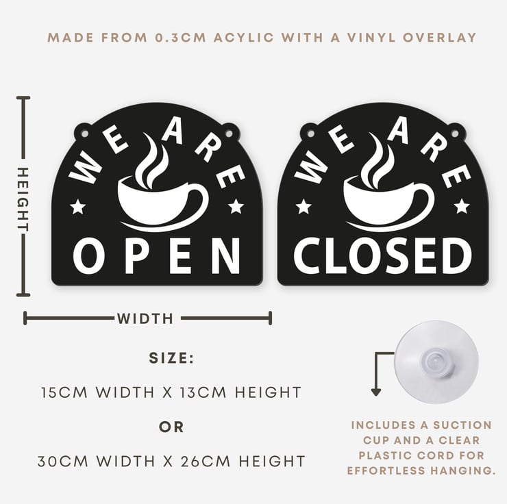 Installation is quick and effortless thanks to the suction cup and clear cord provided. Available in two sizes and a variety of colour combinations, the sign can be tailored to fit seamlessly with your café’s décor and branding.