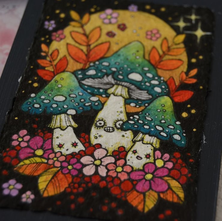 this aceo is an original artwork, hand drawn with a tiny 0.05 nibbed pen, then coloured with ink, artists pens and watercolour paints, on indian khadi paper. khadi paper is handmade from recycled cotton rag, it has a lovely textured surface and deckled edges. i have then mounted the illustration onto 300gsm cardstock, hand painted with a paynes grey to create a dark surrounding edge/background.