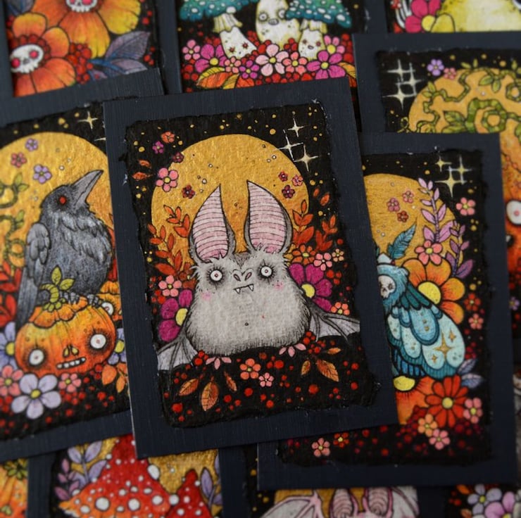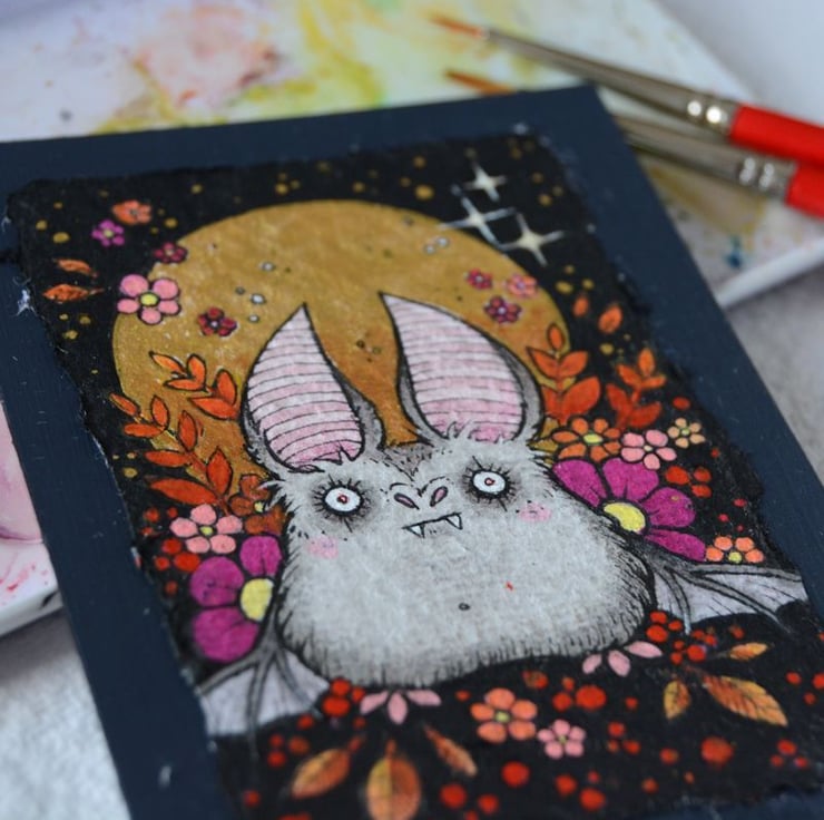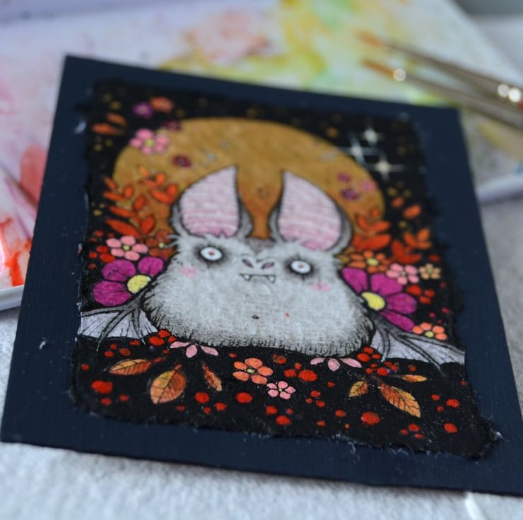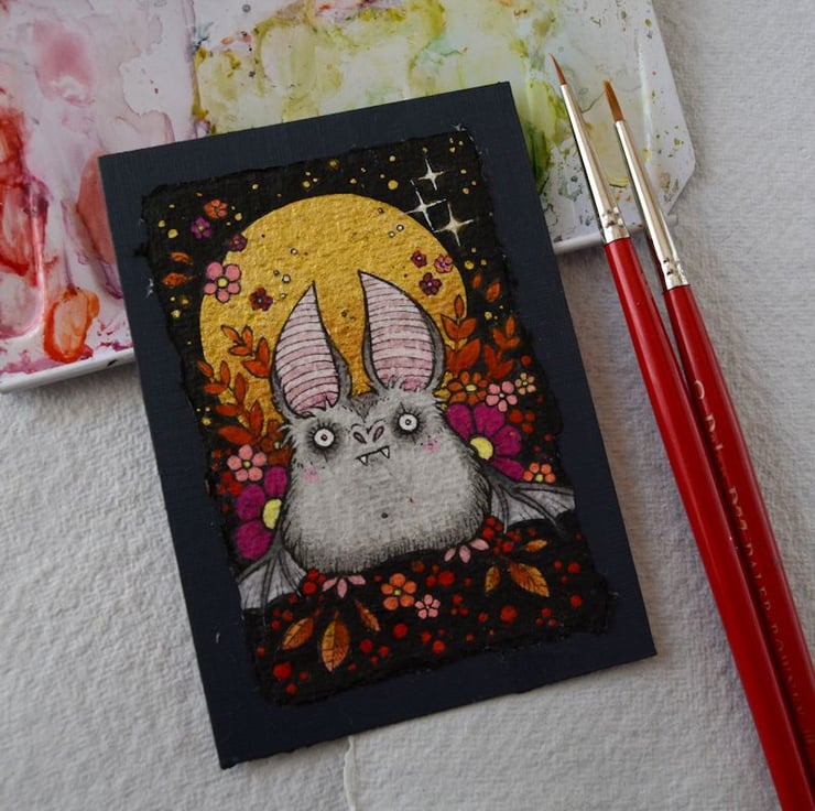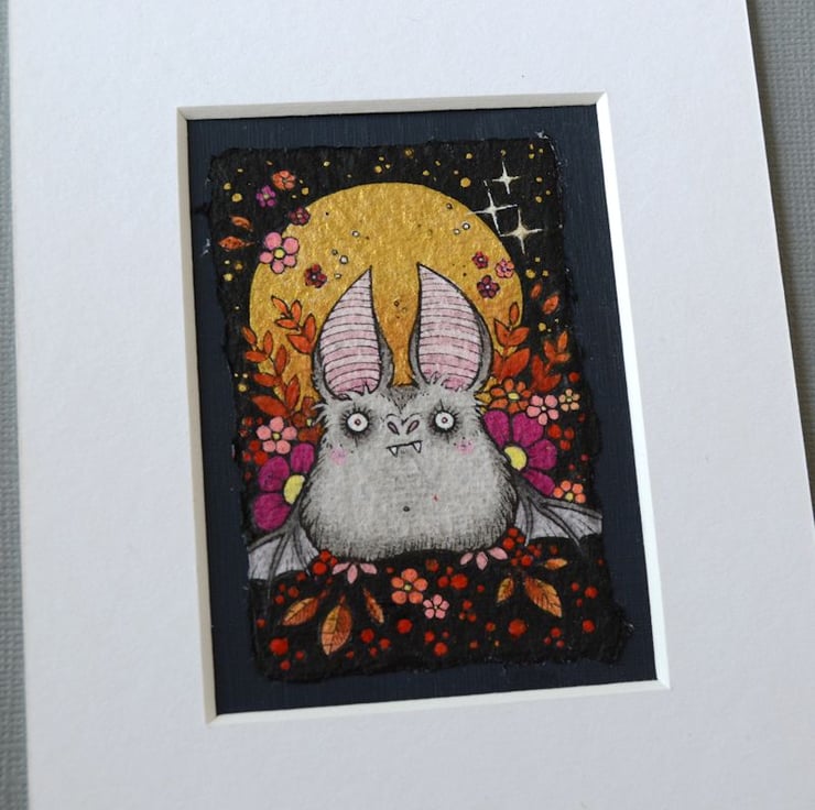 this aceo is an original artwork, hand drawn with a tiny 0.05 nibbed pen, then coloured with ink, artists pens and watercolour paints, on indian khadi paper. khadi paper is handmade from recycled cotton rag, it has a lovely textured surface and deckled edges. i have then mounted the illustration onto 300gsm cardstock, hand painted with a paynes grey to create a dark surrounding edge/background.