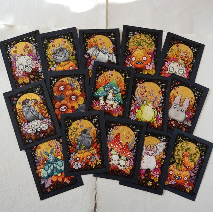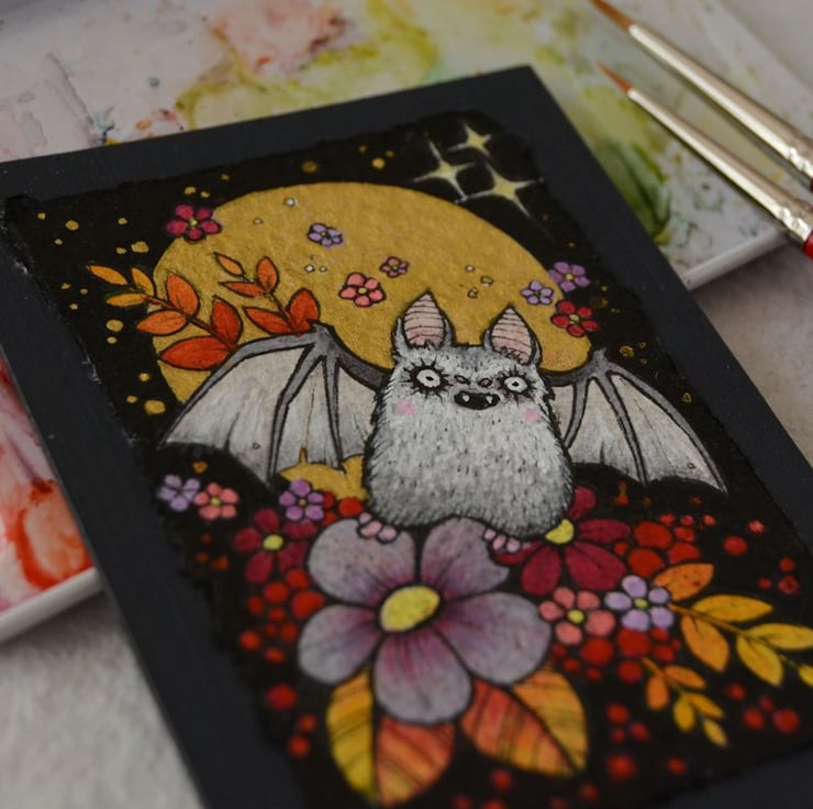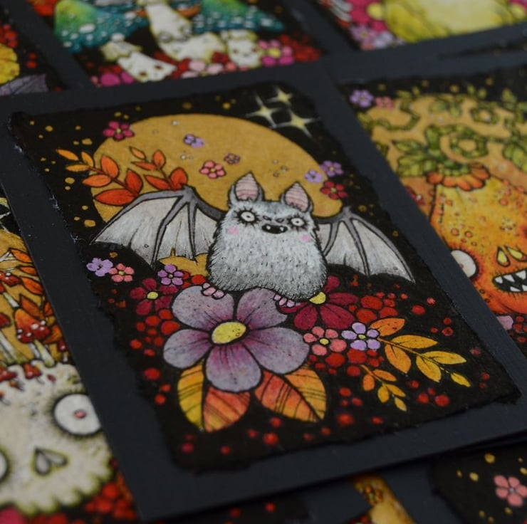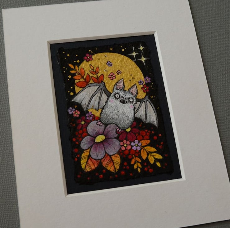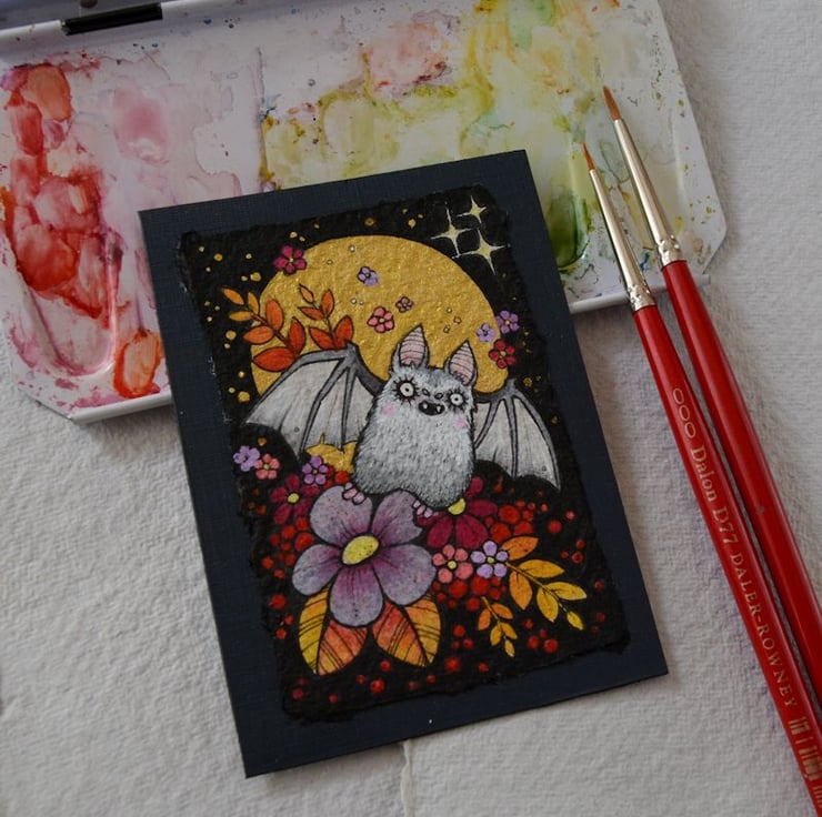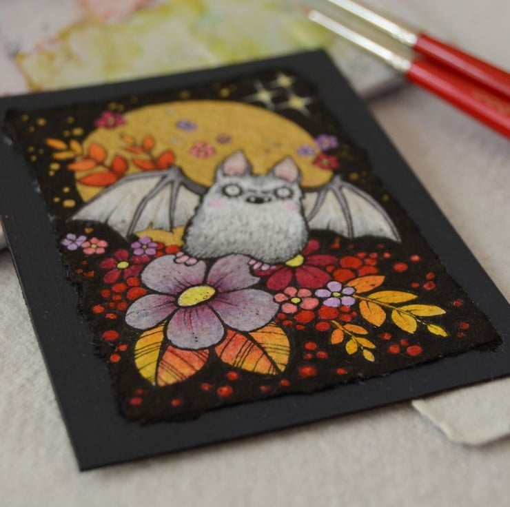 this aceo is an original artwork, hand drawn with a tiny 0.05 nibbed pen, then coloured with ink, artists pens and watercolour paints, on indian khadi paper. khadi paper is handmade from recycled cotton rag, it has a lovely textured surface and deckled edges. i have then mounted the illustration onto 300gsm cardstock, hand painted with a paynes grey to create a dark surrounding edge/background.