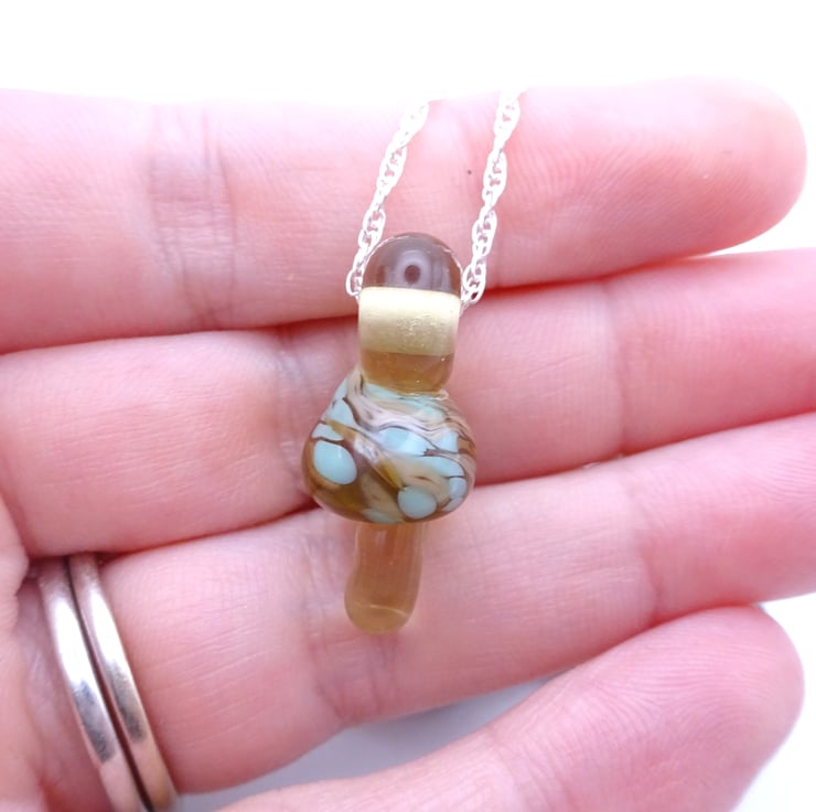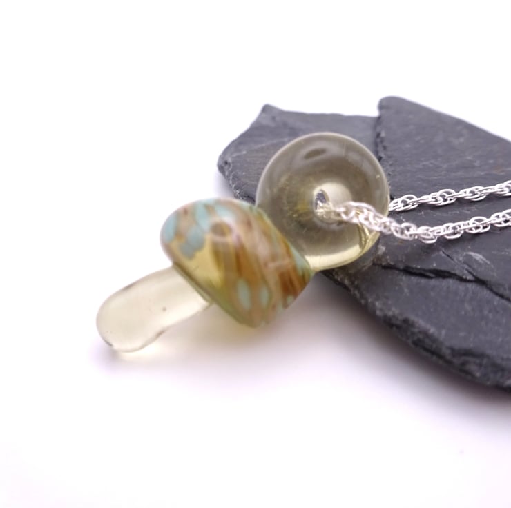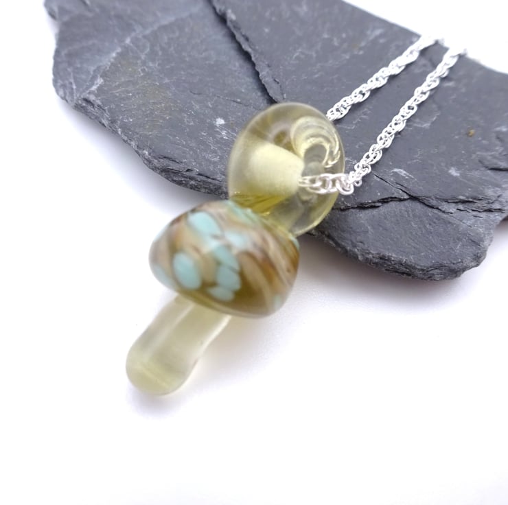 A sterling silver chain strung with a handmade lampwork glass toadstool pendant.