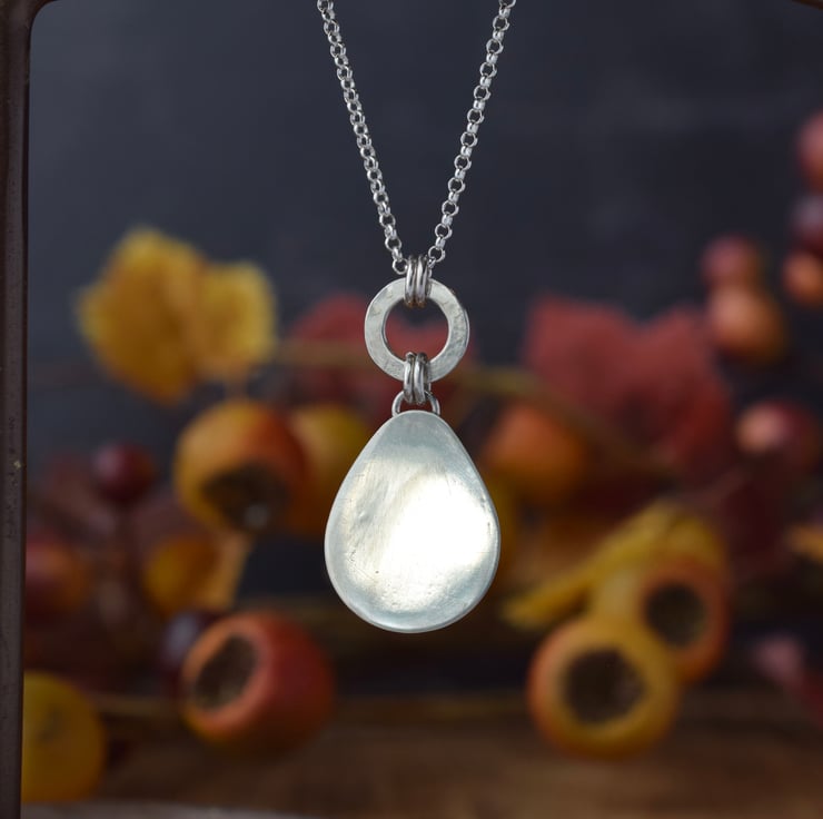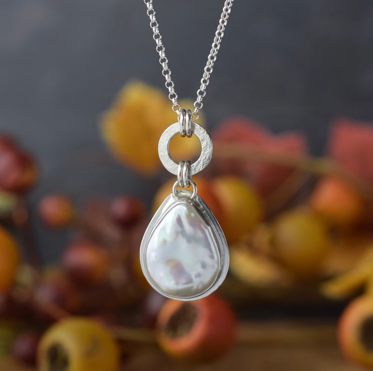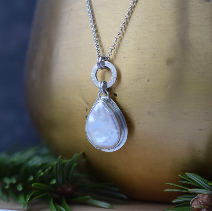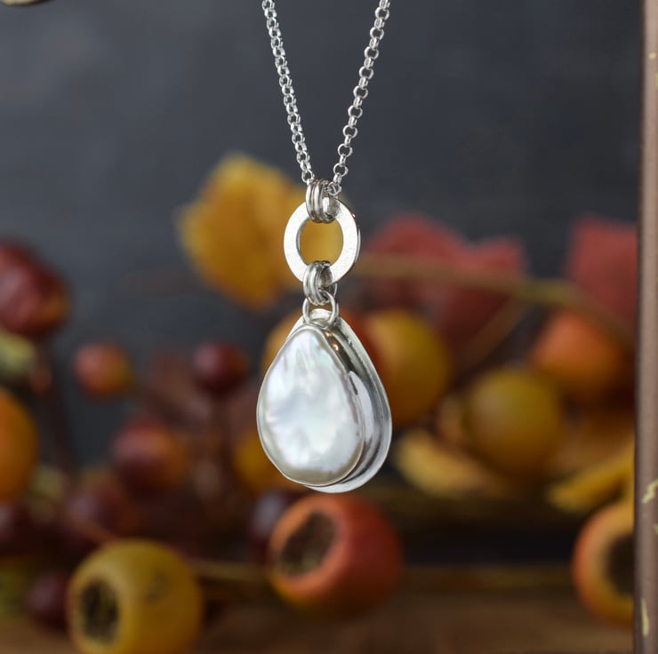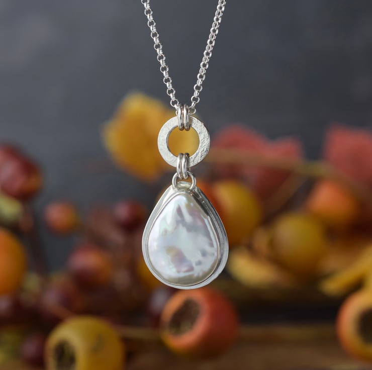 Handmade in solid sterling silver, this statement pearl necklace has been designed and made by Isobel Robinson in Yorkshire, UK. A single, teardrop shaped freshwater pearl has been set in a bespoke bezel surround and hung from a textured silver hoop. Every component has been handcrafted from silver sheet or wire for a truly unique finish.