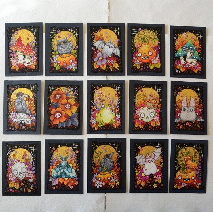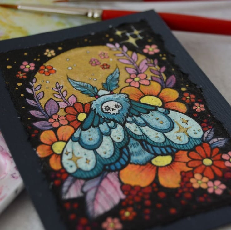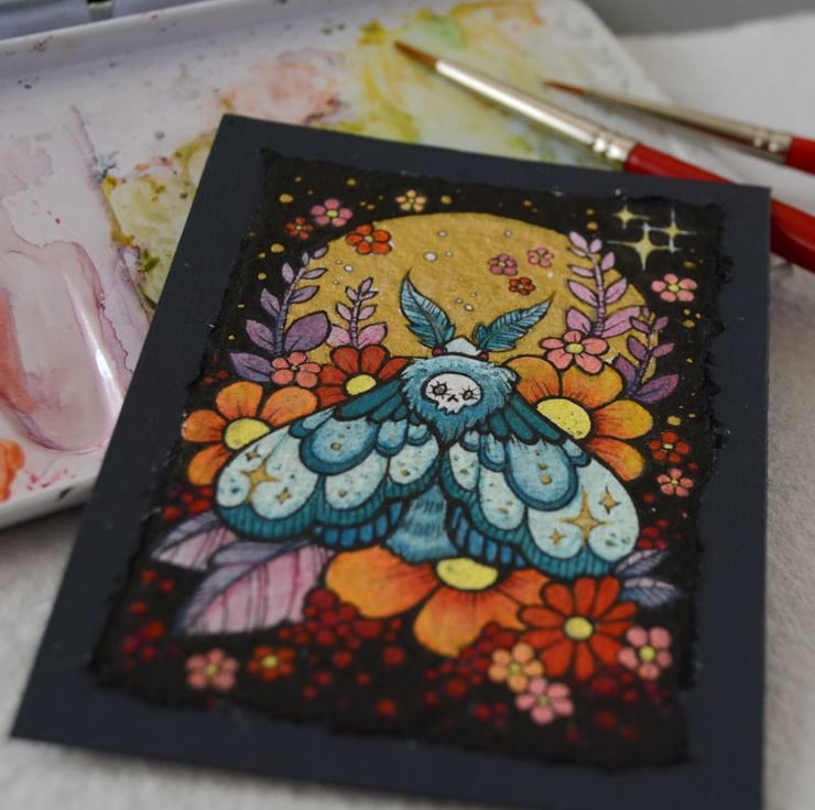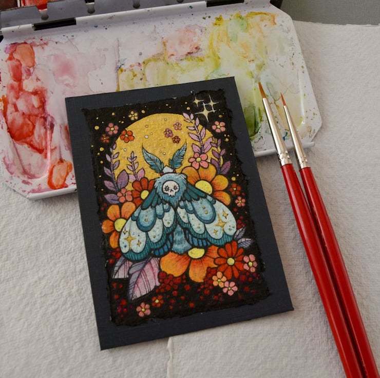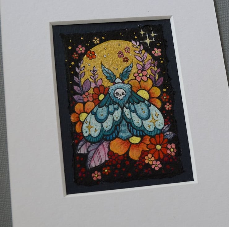 this aceo is an original artwork, hand drawn with a tiny 0.05 nibbed pen, then coloured with ink, artists pens and watercolour paints, on indian khadi paper. khadi paper is handmade from recycled cotton rag, it has a lovely textured surface and deckled edges. i have then mounted the illustration onto 300gsm cardstock, hand painted with a paynes grey to create a dark surrounding edge/background.