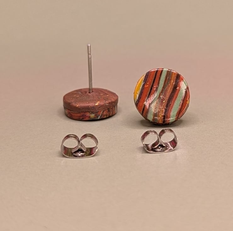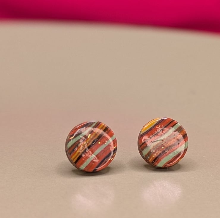 These delightful studs are ready for the autumn season with stripes of mint green, mustard, black, and terracotta brown with a little bit of sparkle from integrated gold leaf.