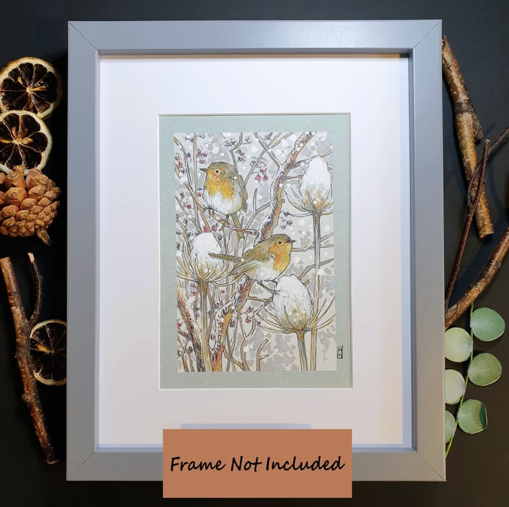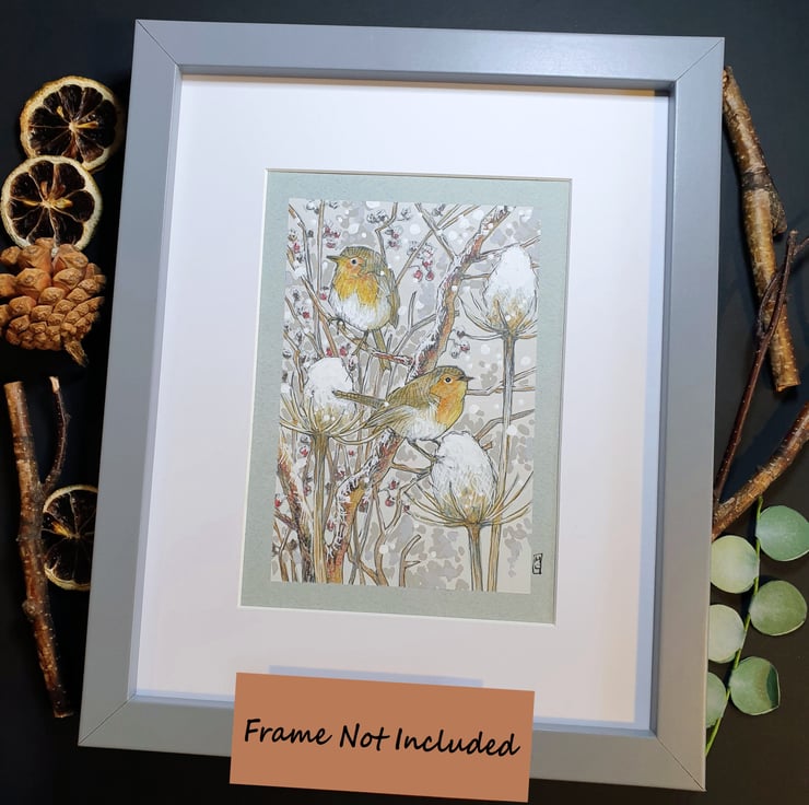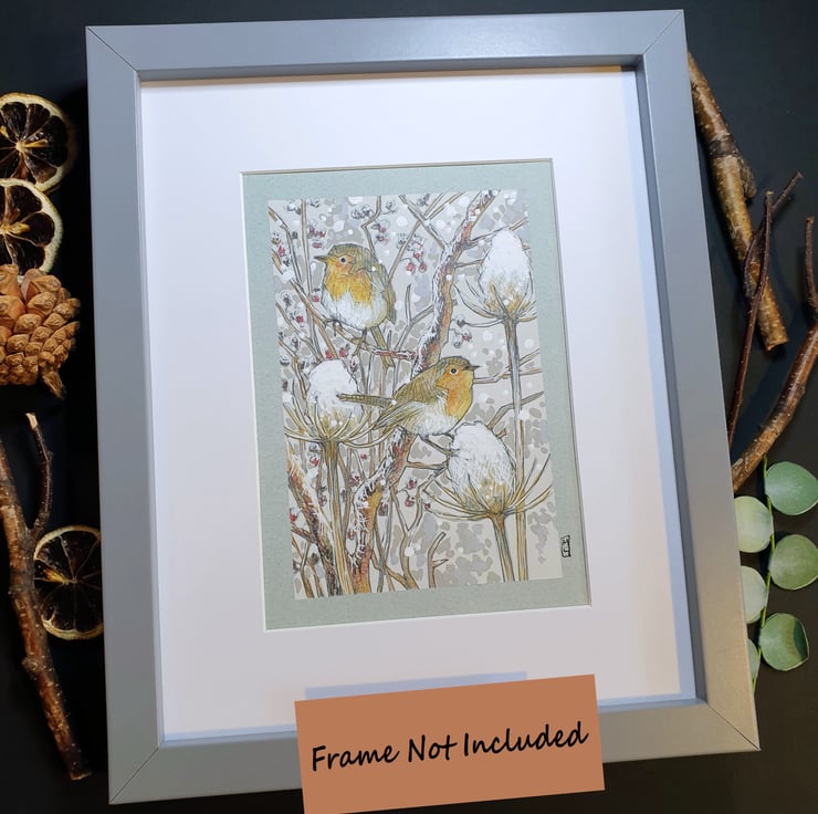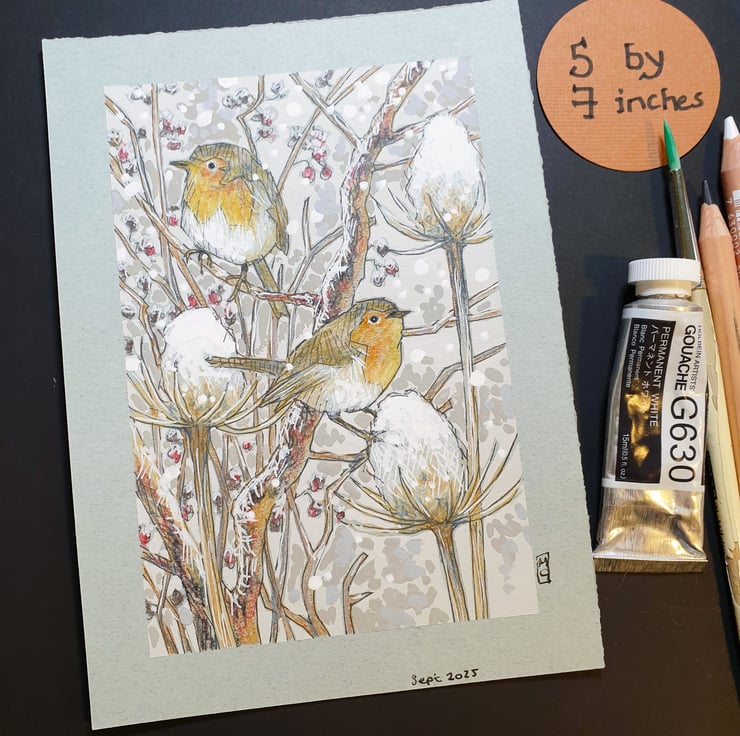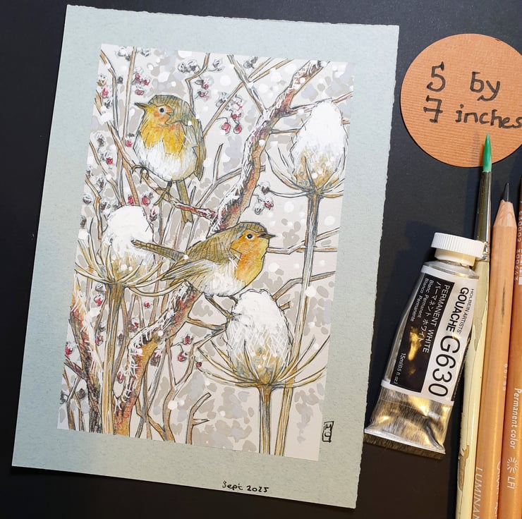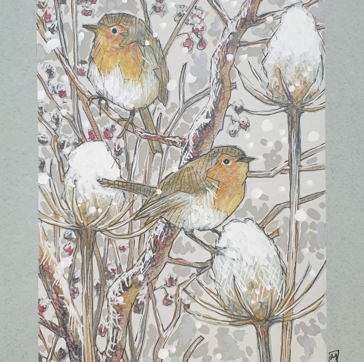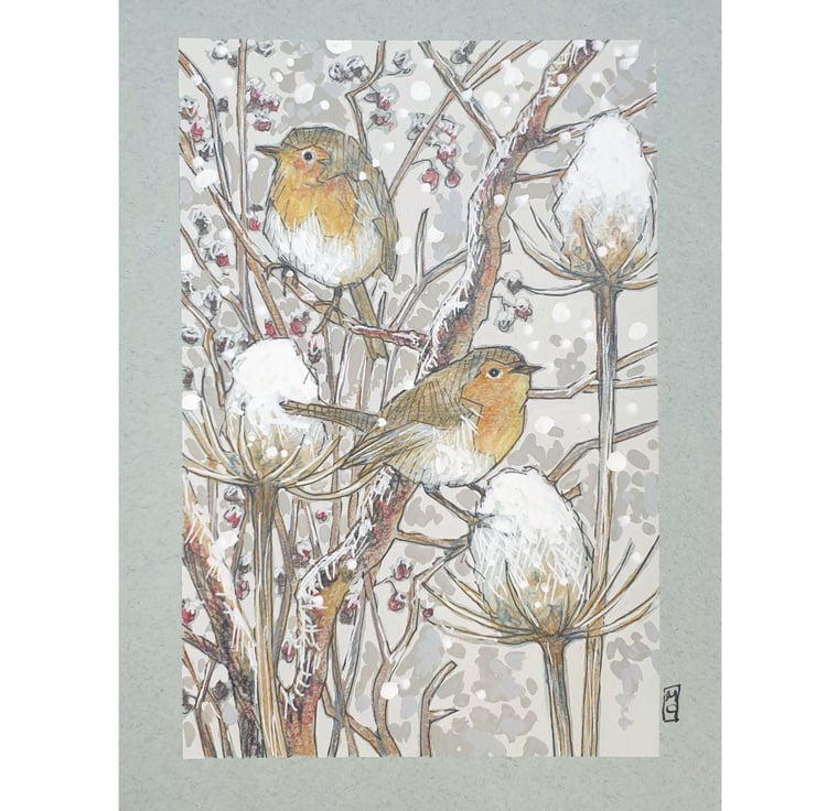 A small drawing of two robins on tree branches in winter, with falling snow. The drawing is on grey pastel paper.