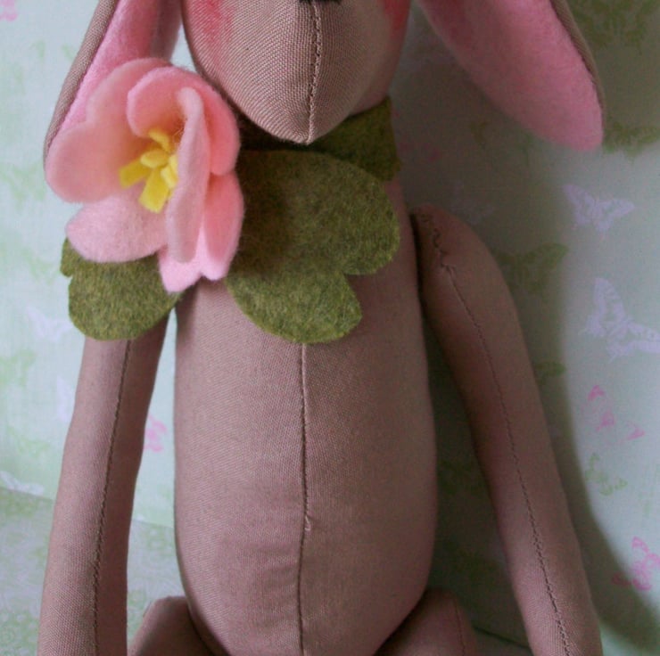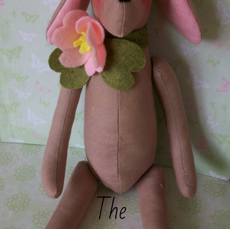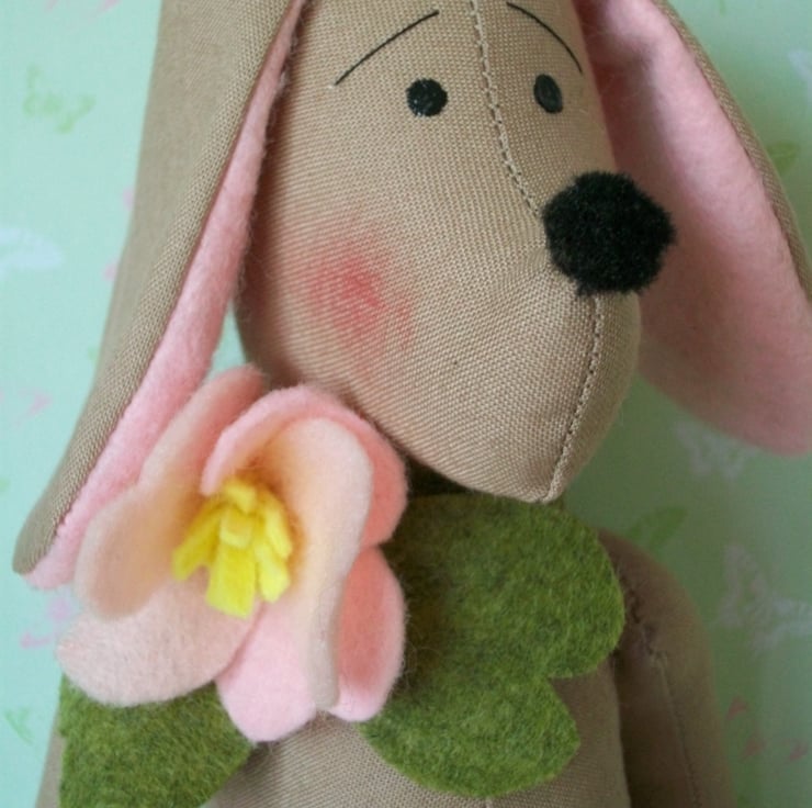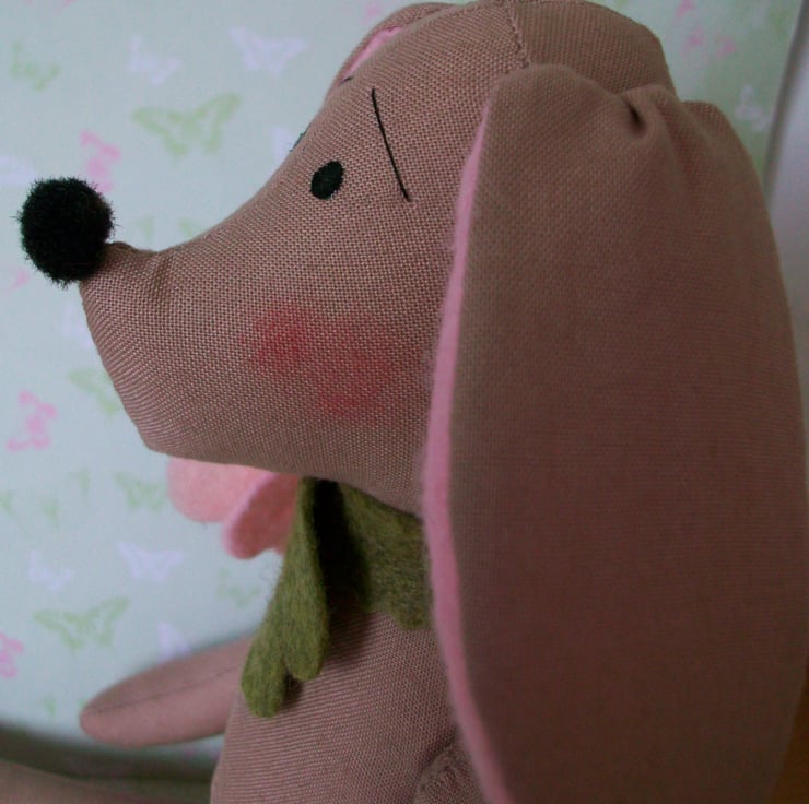 A GREEN FELT COLLAR IS STITCHED AROUND HIS NECK WITH A GENEROUS PINK FELT DOG ROSE.