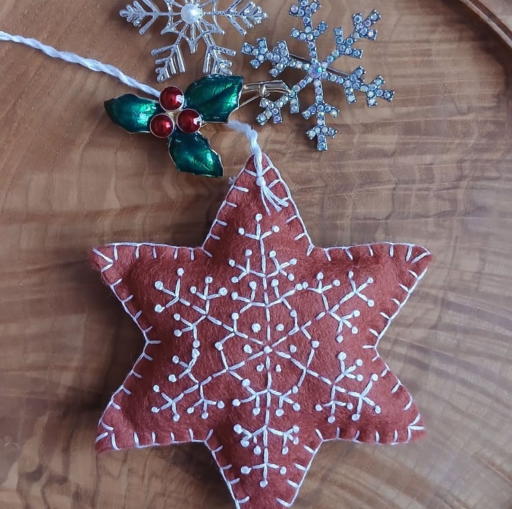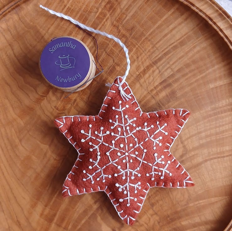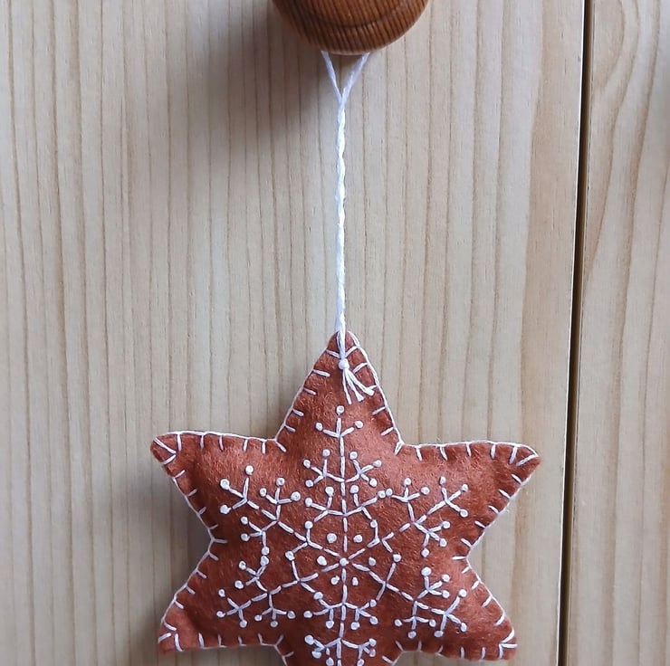 A gingerbread biscuit style tree decoration in the form of a six pointed star and embroidered with a snowflake design - no two are alike. Each decoration is lightly stuffed and finished with white blanket stitch and a twisted thread hanging loop (simply untwist, loop over branch and allow to re-twist).