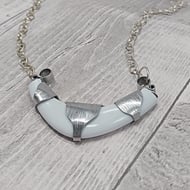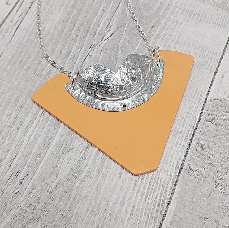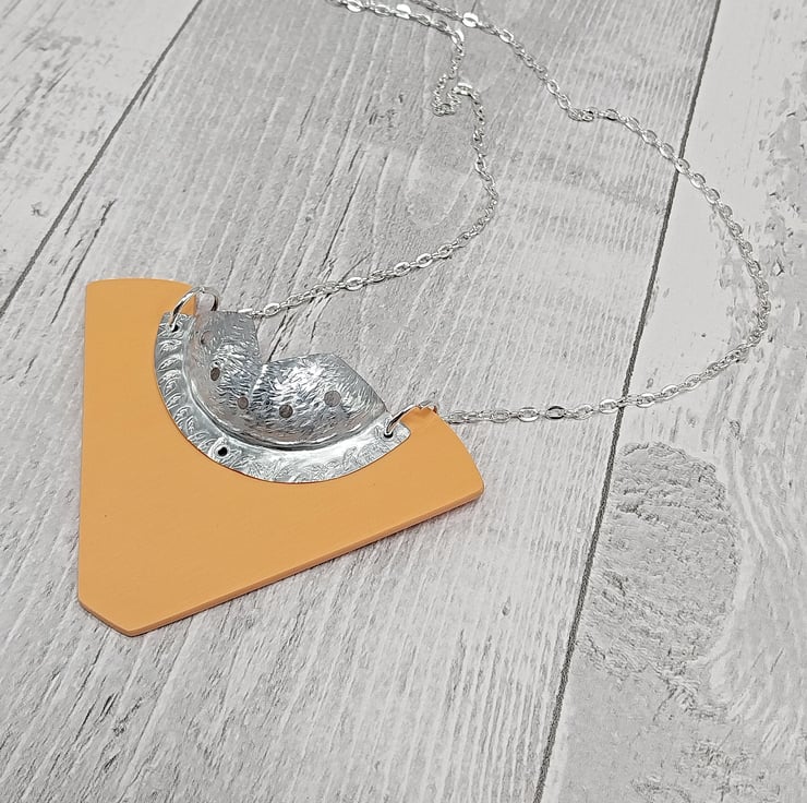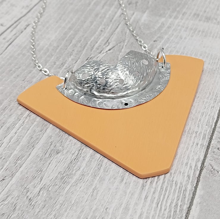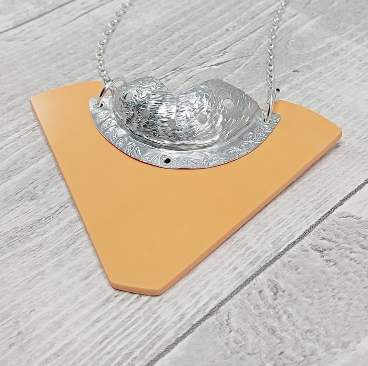 Handmade necklace made from recycled aluminium drink can complemented with the addition of an acrylic shape. The design focuses on the metal base of the can incorporating the domed shape which I have cut, shaped and hammered texture too giving this necklace it’s unique and one-of-a-kind individuality. The acrylic shape cut by hand in a curved triangular shape and delicate peach colour; this is riveted to the metal using aluminium tubing. Eco-friendly material and lightweight and comfortable to wear for all occasions.