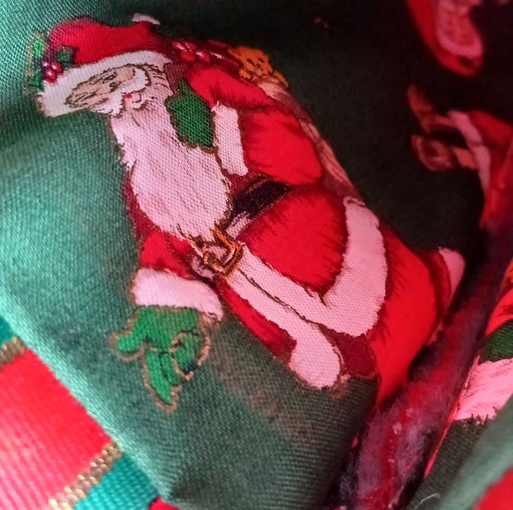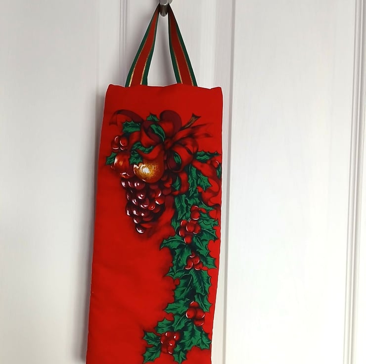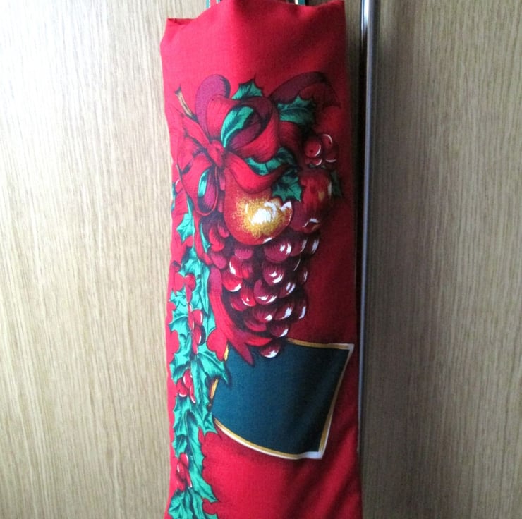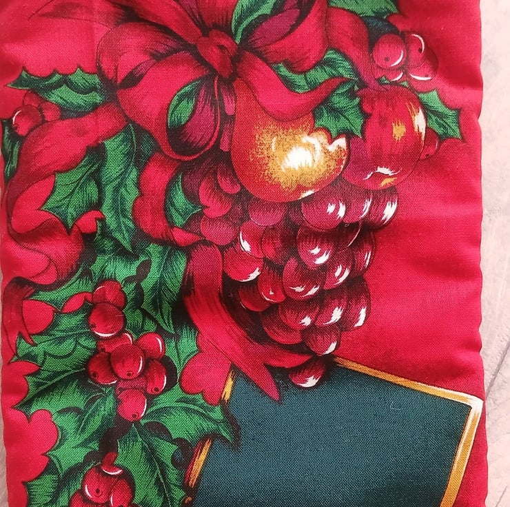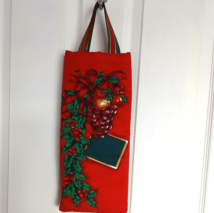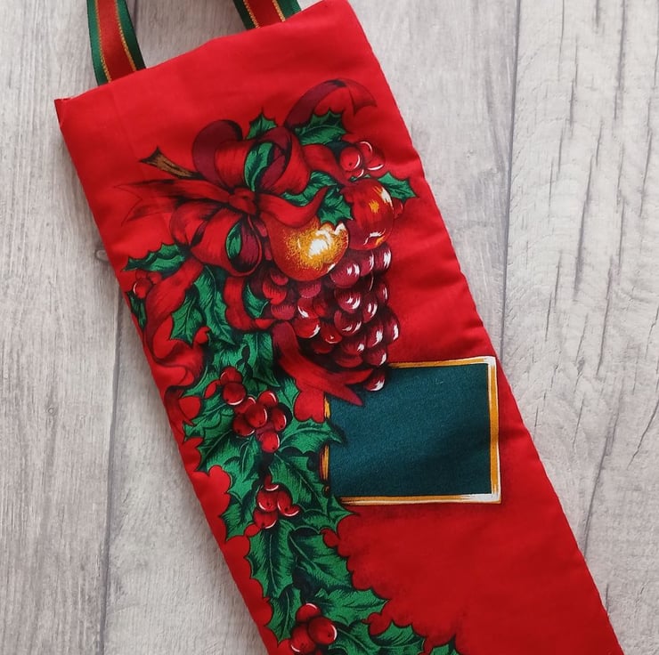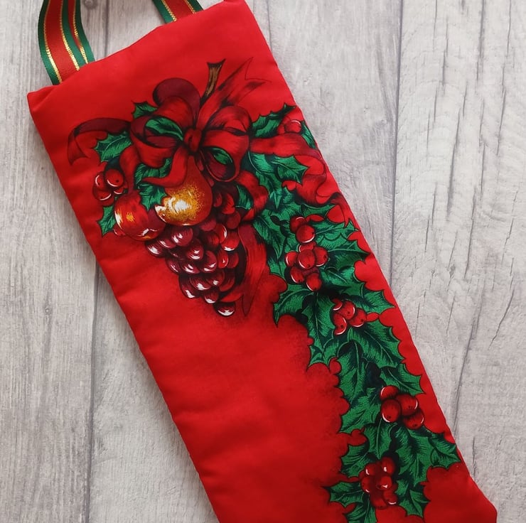 A very festive reusable gift bag suitable for bottles, featuring a design of fruit and holly on a red background. The bag is lightly wadded to protect the contents, lined with a jolly Father Christmas print on green and finished with sturdy ribbon handles. Will comfortably take a standard 750ml bottle.