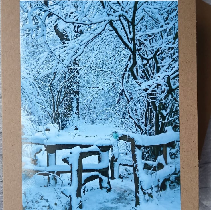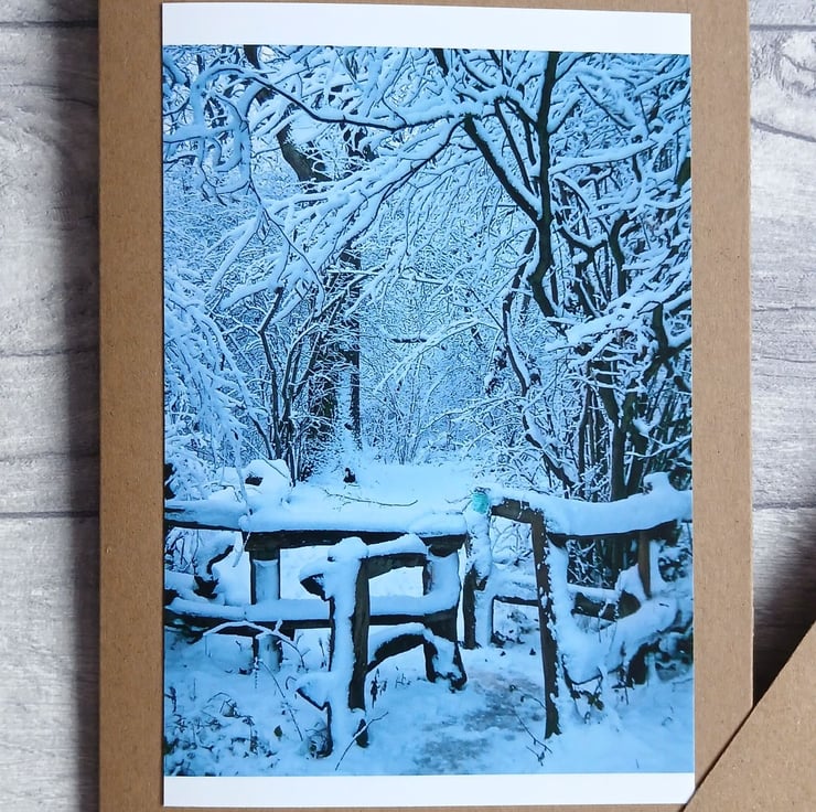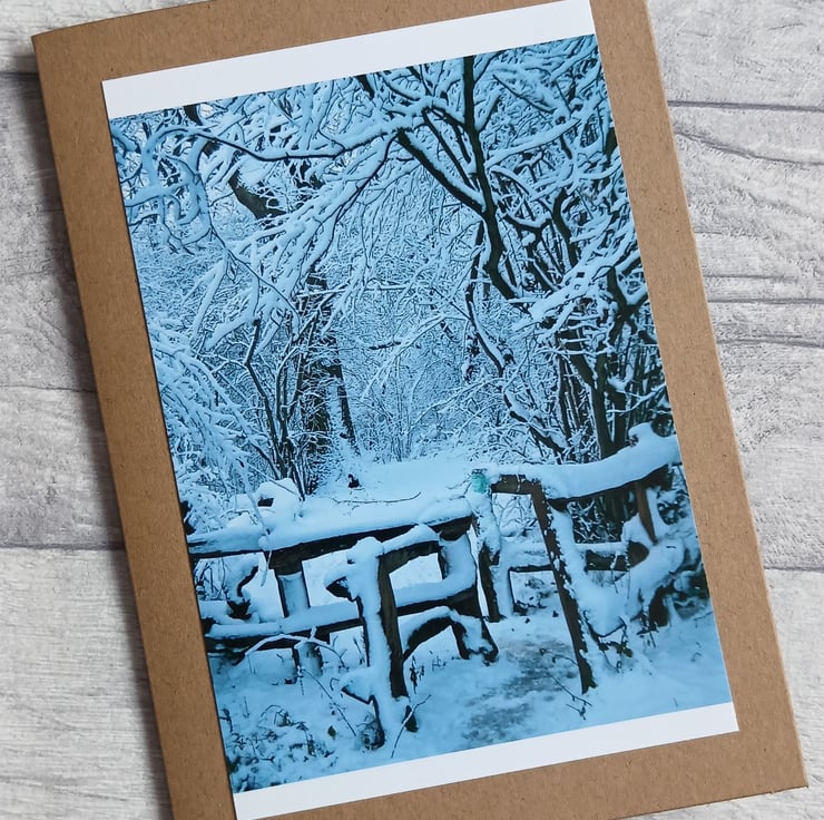 A view that could be straight out of Narnia, our local wood, resplendent in snow - the photo taken on a magical morning several years ago, and now available as a photo greetings card. A 4 x 6 inch photo print mounted on a 5 x 7 inch Kraft card, with envelope. Supplied in a cellophane sleeve. Blank for your own message.