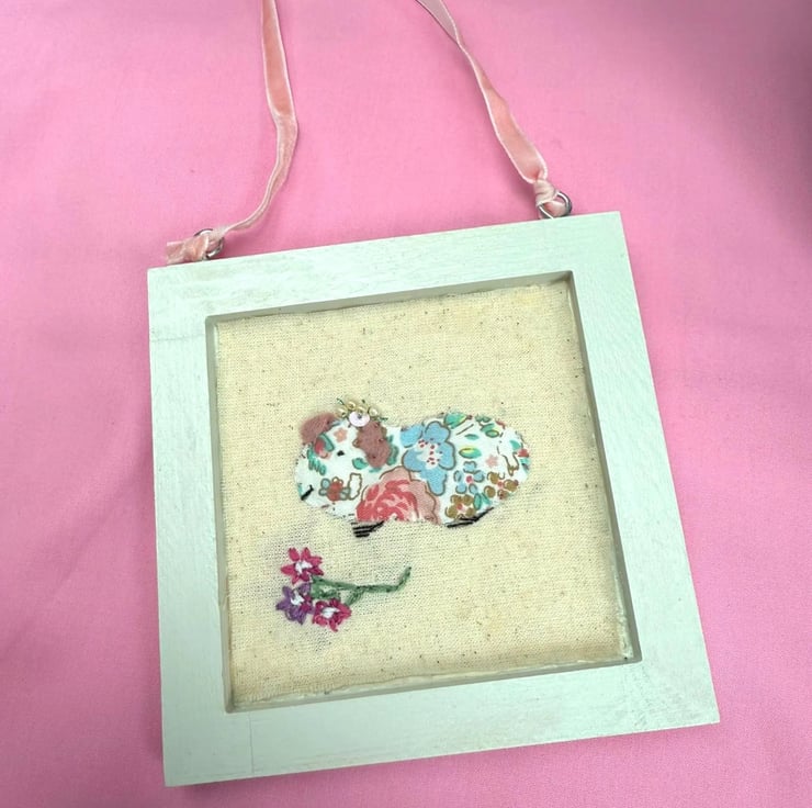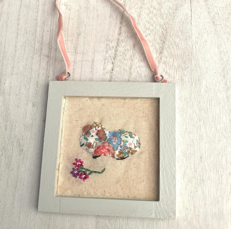 Handmade 4" framed embroidery features a lovingly crafted guinea pig in a whimsical, vintage-inspired appliqué design. Perfect for guinea pig & animal lovers and fans of all things shabby chic, this piece brings a warm and cozy atmosphere to any room. Can be displayed on a shelf or hung on a wall etc.