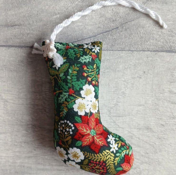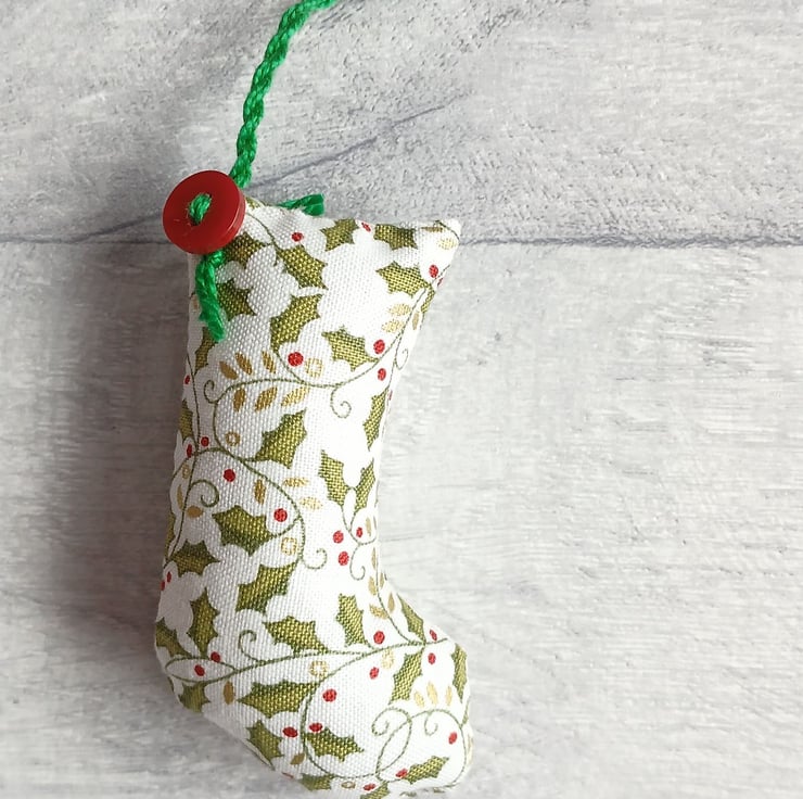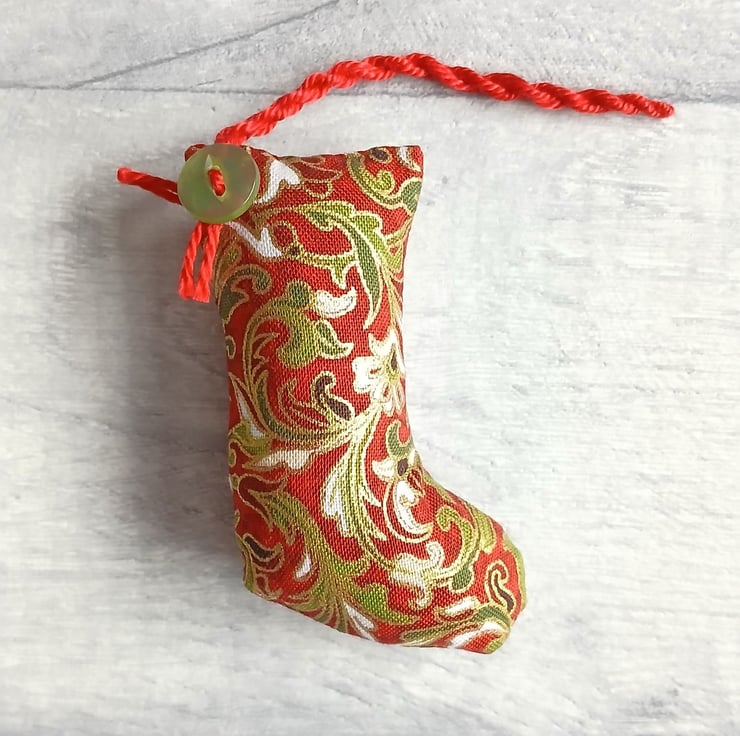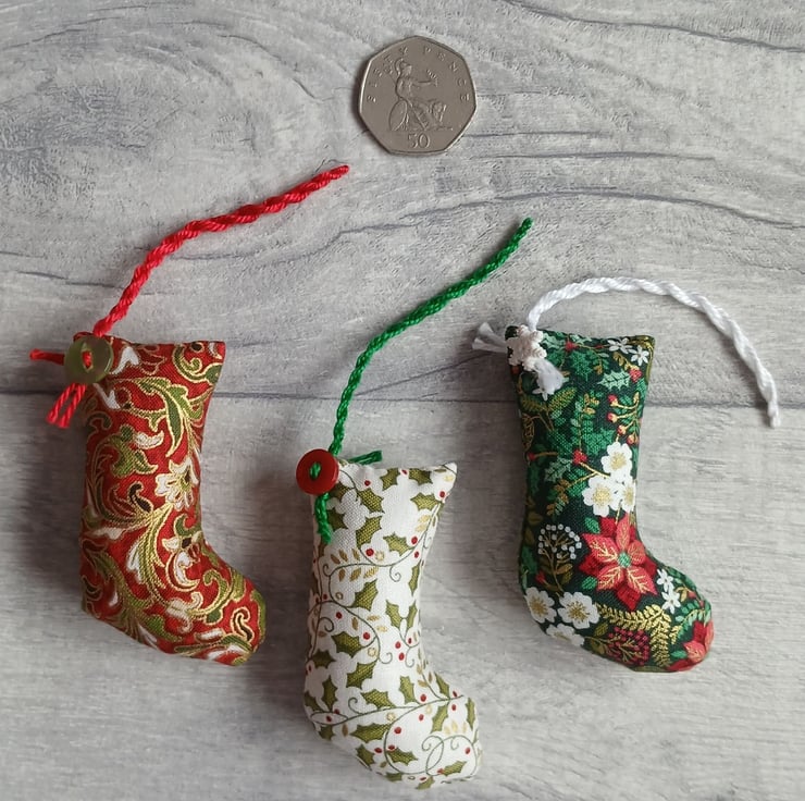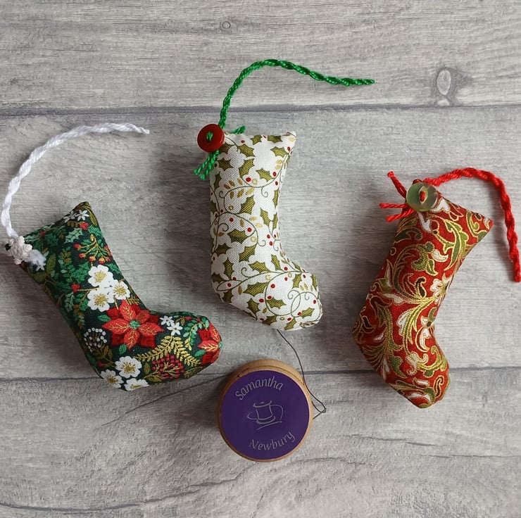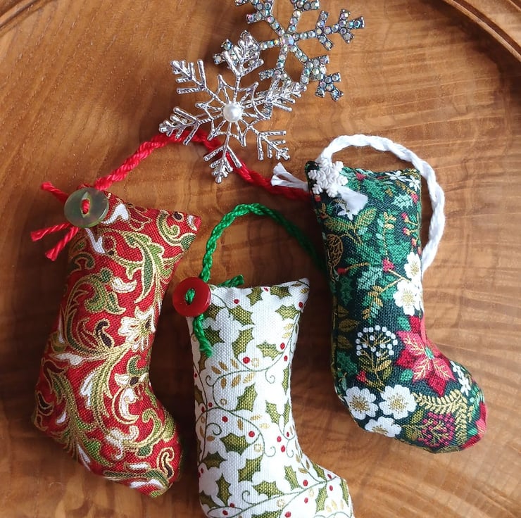 A trio of tiny Christmas stocking tree decorations made form some of the treasured snippets in my scrapbox. Each stocking measures just 7 cm from top to bottom and is stuffed with scraps of surplus wadding from other projects. Finished with co-ordinating buttons and twisted thread hanging loops - simply untwist, hang over branch and allow to re-twist. Each set is unique and would make a lovely addition to any festive tree.