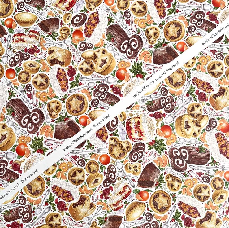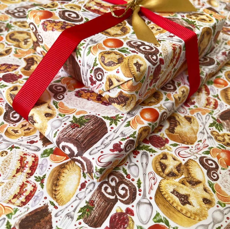 Drawn in coloured pencil and full of nostalgic warmth, the design includes festive favourites like Yule log, trifle, mince pies, oranges and candy canes – bringing cosy, vintage charm to your wrapping.