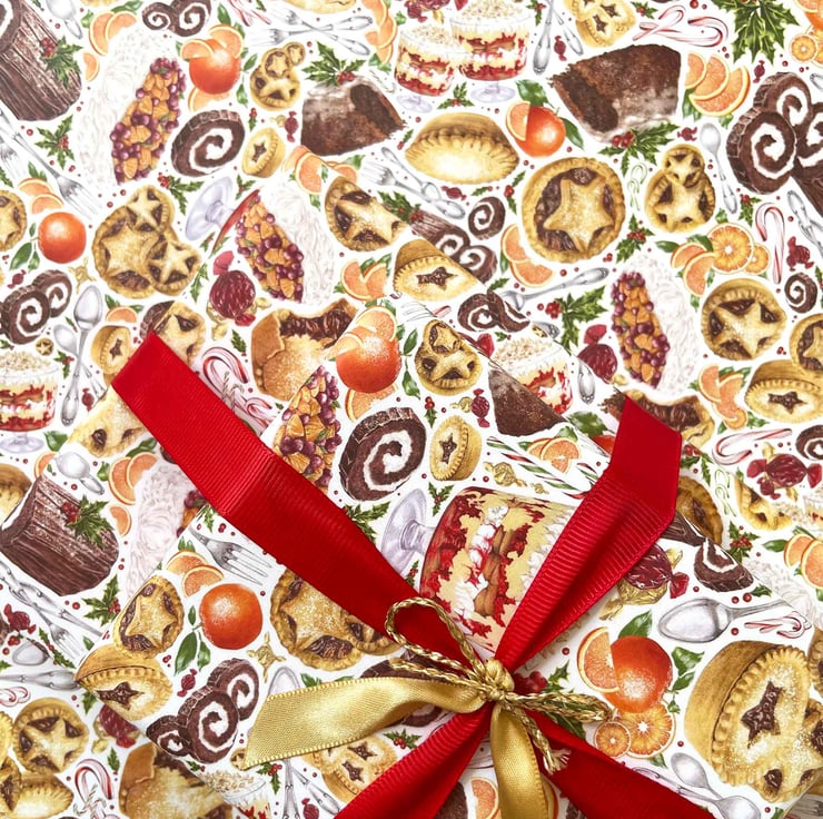 Wrap your gifts in festive foodie charm! This luxury A2 Christmas Sweet Treats gift wrap features hand-drawn illustrations of classic seasonal desserts, perfect for bakers, food lovers and anyone who celebrates the joy of holiday traditions.
