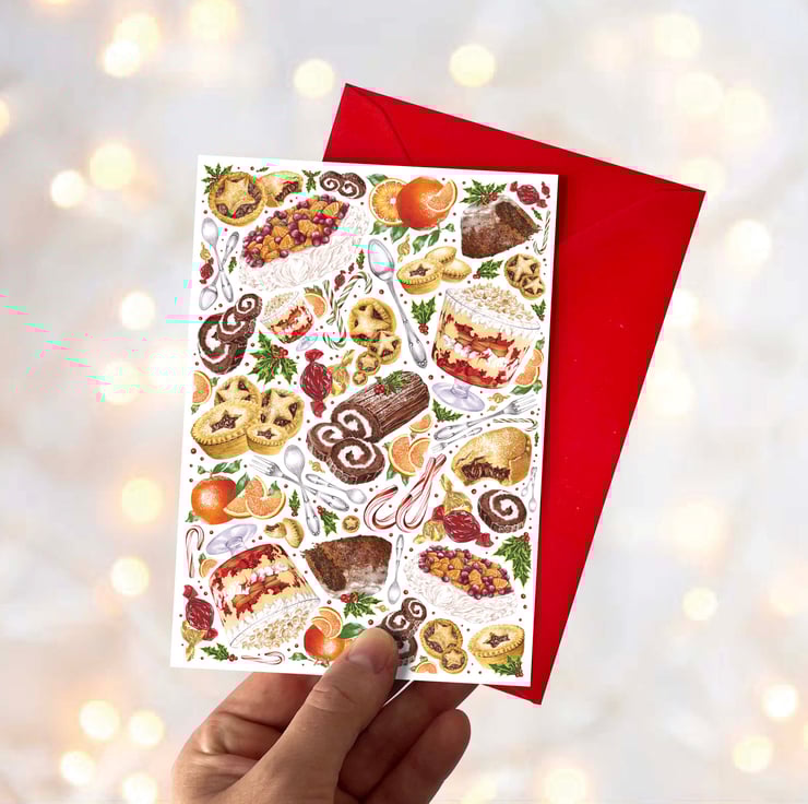 This design was inspired by the joy of festive baking and the comforting tradition of sharing sweet treats at Christmas. I wanted to capture the magic of those familiar flavours – trifle, mince pies, Yule log – in a way that felt warm, nostalgic, and joyful. Each element was hand-drawn in coloured pencil to celebrate the beauty of food as a love language during the festive season.