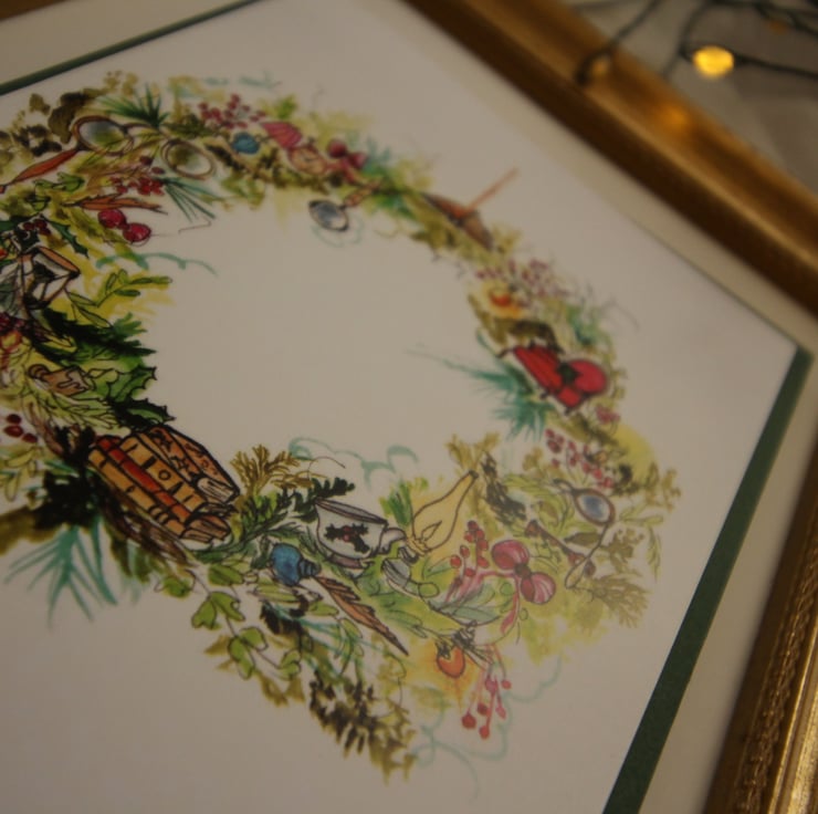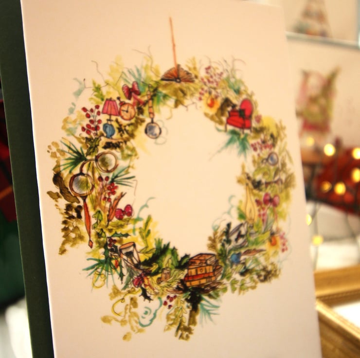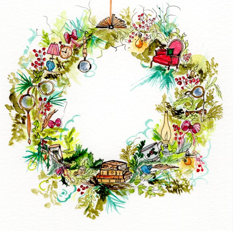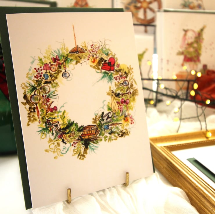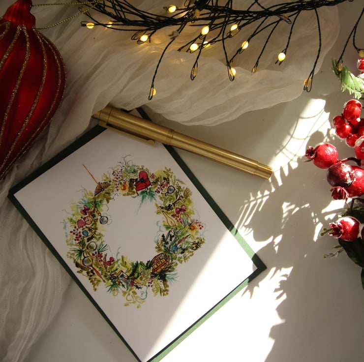 A Christmas wreath reimagined for readers and writers. Decorated with miniature books, reading glasses, lamps, twinkling lights, and cosy details, this hand-painted design captures the warmth of curling up with a favourite story. A thoughtful festive greeting for bookworms, book club friends, and anyone who finds joy between the pages.