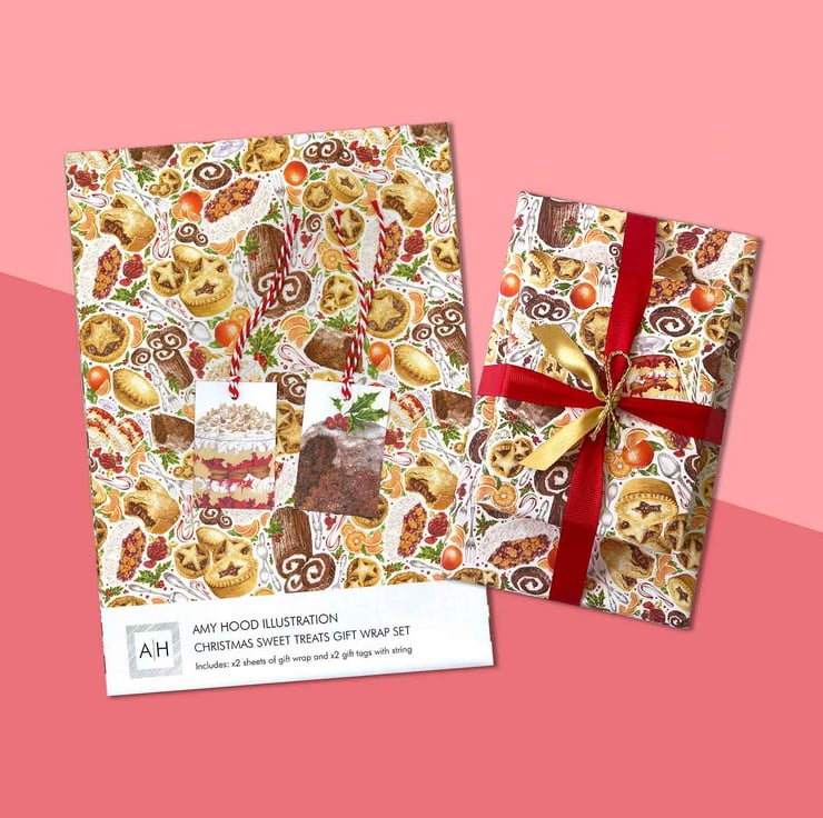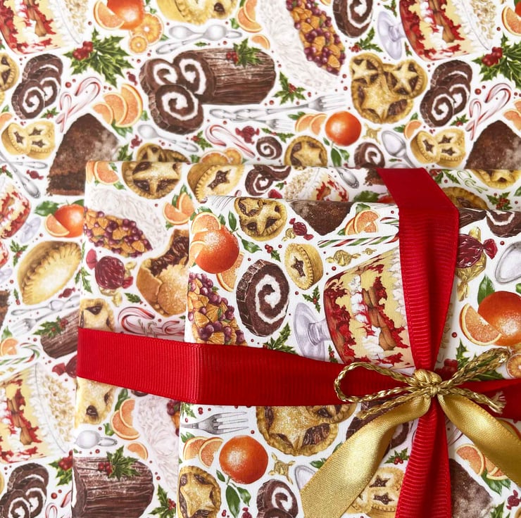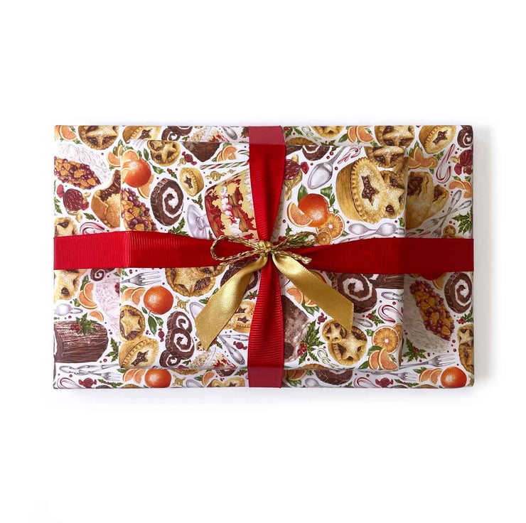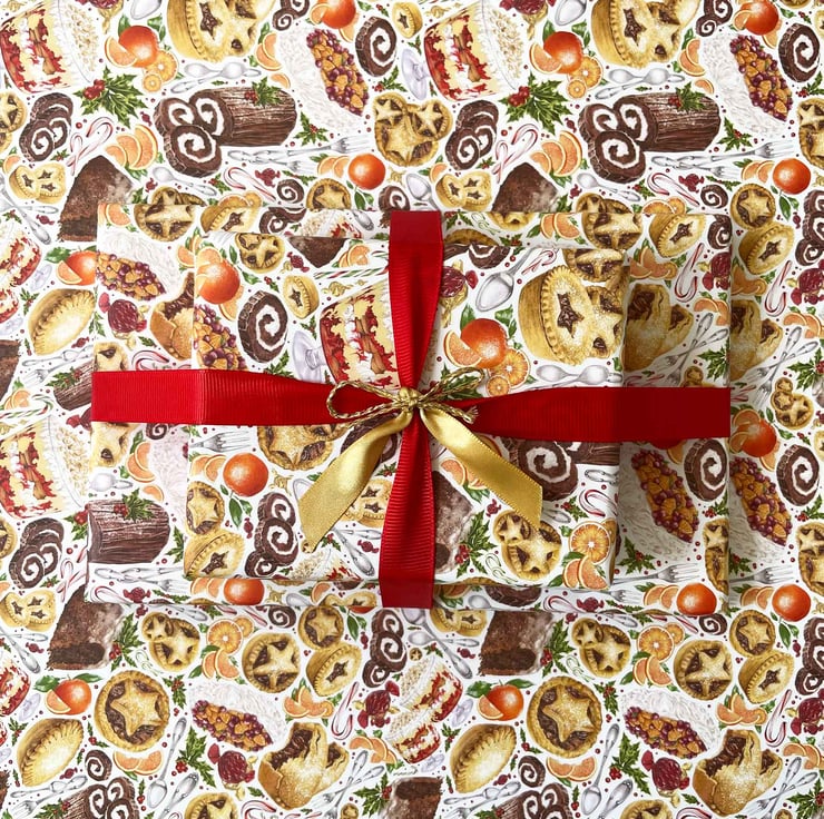 Wrap your Christmas gifts in festive foodie flair! This two-sheet Christmas Sweet Treats gift wrap set is perfect for adding a cosy, nostalgic touch to your holiday gifting. Featuring my original hand-drawn illustrations in coloured pencil, the design includes all your seasonal favourites – trifle, Yule log, mince pies, oranges, and candy canes – all drawn in a warm, natural style.